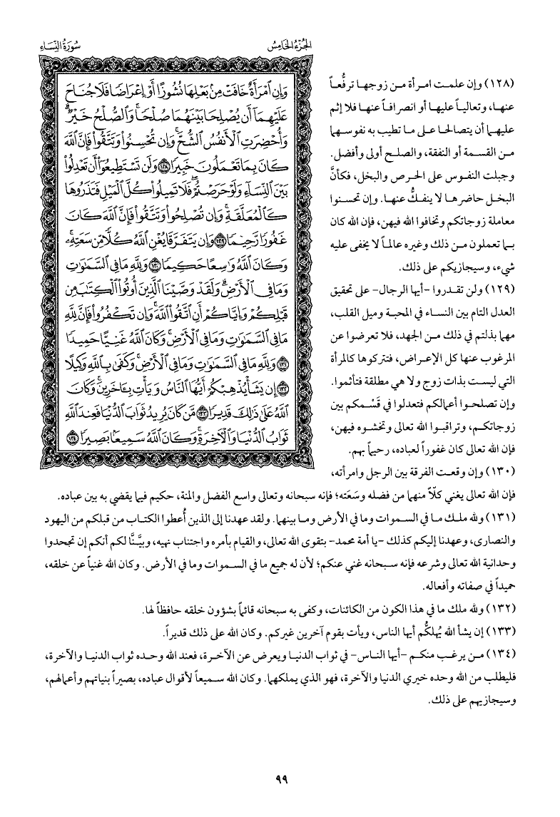 ولن تقدروا -أيها الرجال- على تحقيق العدل التام بين النساء في المحبة وميل القلب، مهما بذلتم في ذلك من الجهد، فلا تعرضوا عن المرغوب عنها كل الإعراض، فتتركوها كالمرأة التي ليست بذات زوج ولا هي مطلقة فتأثموا. وإن تصلحوا أعمالكم فتعدلوا في قَسْمكم بين زوجاتكم، وتراقبوا الله تعالى وتخشوه فيهن، فإن الله تعالى كان غفورًا لعباده، رحيمًا بهم.