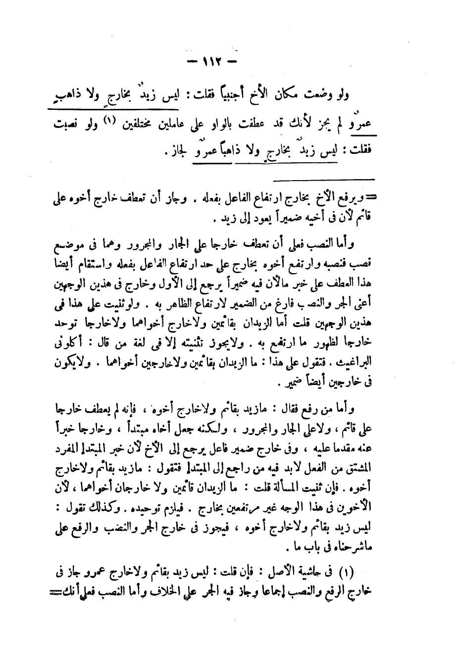 ولو وضعت مكان الأخ أجنبيا فقلت: ليس زيد بخارج ولا ذاهب عمرو لم يجز لأنك قد عطفت بالوا على عاملين مختلفين ولو نصبت فقلت: ليس زيد بخارج ولا ذاهبا عمرو لجاز.
