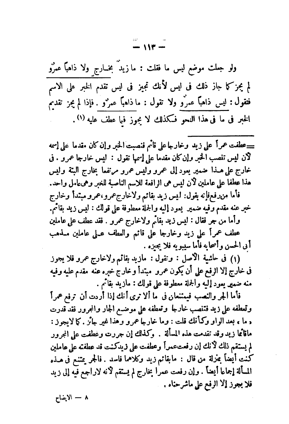 ولو جعل موضع ليس ما فقلت: ما زيد بخارج ولا ذاهبا عمرو لا يجز كما جاز ذلك في ليس لأنك تجيز في ليس تقدم الخبر على الاسم فتقول: ليس ذاهبا عمرو ولا تقول: ما ذاهبا عمرو. فإذا لم يجز تقديم الخبر في ما في هذا النحو فكذلك لا يجوز فيما عطفت عليه.