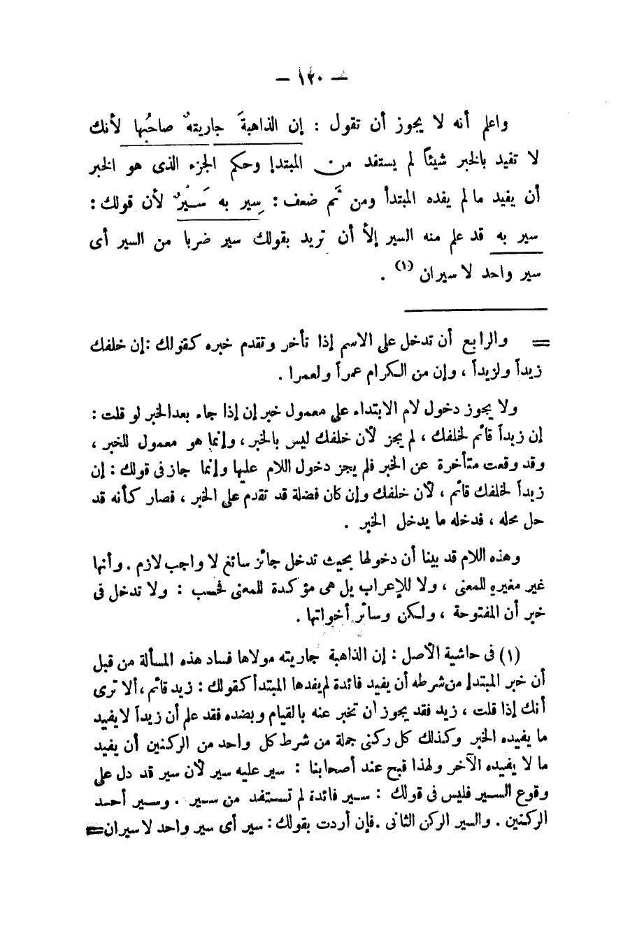 واعلم أنه لا يجوز أن تقول: إن الذاهبة جاريته صاحبتها لأنك لا تفيد بالخبر شيئا لم يستفد من المبتدأ وحكم الجزء الذي هو الخبر أن يفيد ما لم يفده المبتدأ وحكم الجزء الذي هو الخبر أن يفيد ما لم يفده المبتدأ ومن ثم ضعف: سير به سير لأن قولك: سير به قد علم منه السير إلا أن تريد بقولك سير ضربا من السير أي سير واحد لا سيران