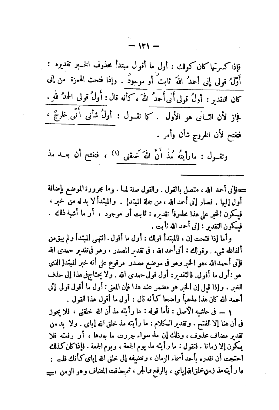 فإذا كسرتها كان كولك: أول ما أقول مبتدأ محذوف الخبر تقديره: أول قولي إني أحمد الله ثابت أو موجود. وإذا فتحت الهمزة من إني كان التقدير: أول قولي أني أحمد الله، كأنه قال: أول قولي الحمد لله. فجاز لأن الثاني هو الأول. كما تقول: أول شأني أني خارج، فتفتح لأن الخروج شأن وأمر.