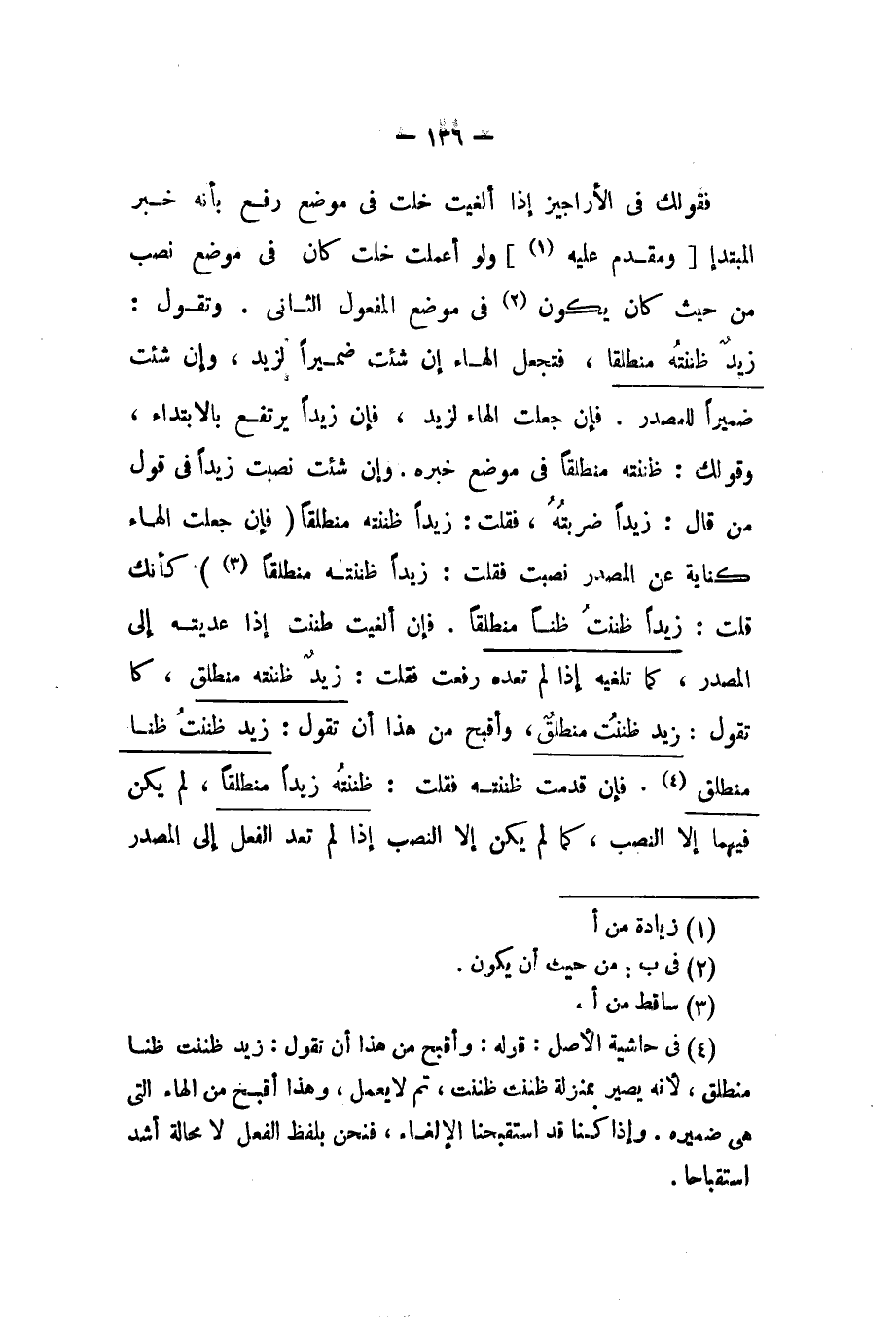 فقولك في الأراجيز إذا ألغيت خلت في موضع رفع بأنه خبر المبتدأ [ومقدم عليه] ولو أعملت خلت كان في موضع نصب من حيث كان يكون في موضع المفعول الثاني. وتقول: زيد ظننته منطلقا، فتجعل الهاء إن شئت ضميراً لزيد، وإن شئت ضميراً للمصدر. فإن جعلت الهاء لزيد، فإن زيداً يرتفع بالابتداء، وقولك: ظننته منطلقا في موضع خبره، وإن شئت نصبت زيدا في قول من قال: زيداً ضربته، فقلت: زيدا ظننته منطلقا (فإن جعلت الهاء كناية عن المصدر نصبت فقلت: زيداً ظننته منطلقا) كأنك قلت: زيدا ظننت ظنا منطلقا. فإن ألغيت ظننت إذا عديته إلى المصدر/ كما تلغيه إذا لم تعده رفعت فقلت" زيد ظننته منطلق، كا تقول: زيد ظننت منطلق، وأقبح من هذا أن تقول: زيد ظننت ظنا منطلق. فإن قدمت ظننته فقلت: ظننته زيداً منطلقا، ولم يكن فيهما إلا النصبن كما لم يكن إلا النصب إذا لم تعد الفعل إلى المصدر