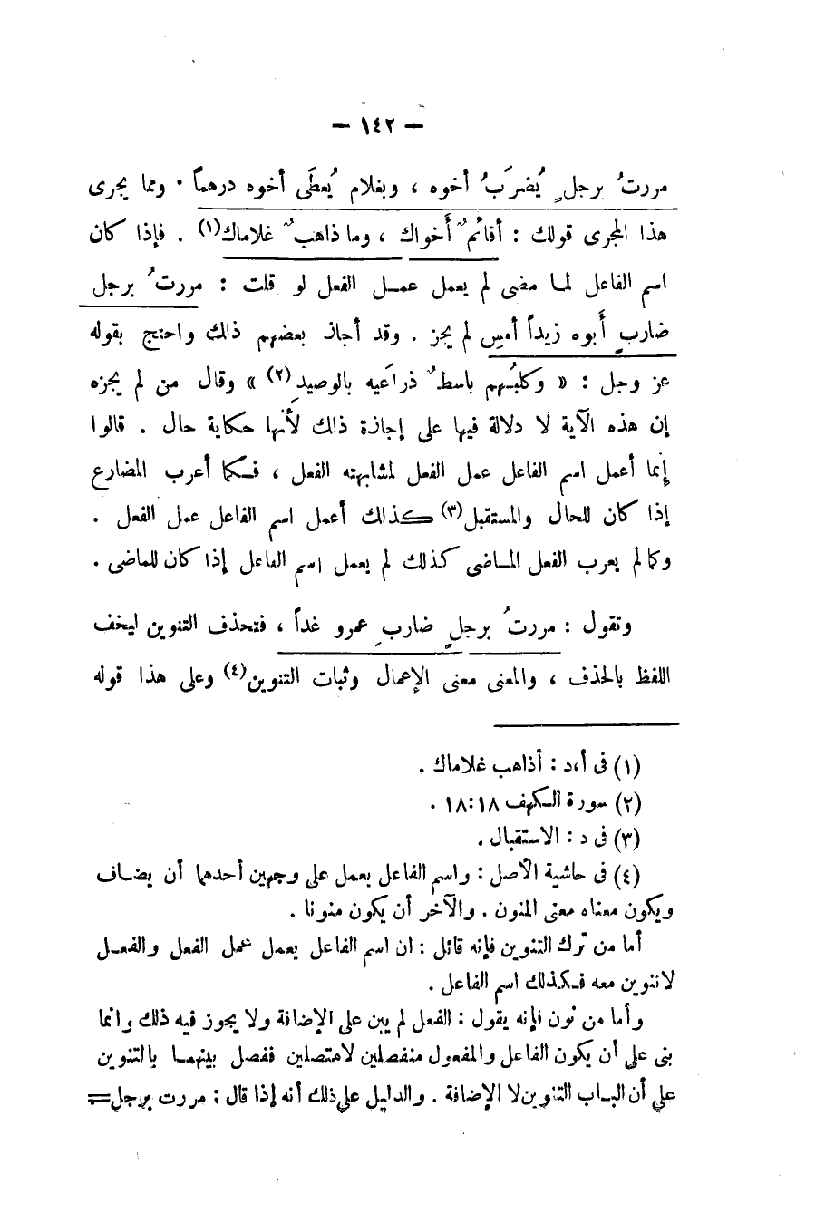 مررت برجل يضرب أخوه، وبغلام يعطي أخوه درهما. ومما يجري هذا المجرى قولك: أقائم أخواك، وما ذاهب غلامك. فإذا كان اسم الفاعل لما مضى لم يعمل عمل الفعل لو قلت: مررت برجل ضارب أبوه زيداً أمس لم يجز. وقد أجاز بعضهم ذلك واحتج بقوله عز وجل: {وكلبهم باسط ذراعيه بالوصيد} وقال من لم يجزه إن هذه الآية لا دلالة فيها على إجازة ذلك لأنها حكاية حال. قالوا إنما أعمل اسم الفاعل عمل الفعل لمشابهته الفعل، فكما أعرب المضارع إذا كان للحال والمستقبل كذلك أعمل اسم الفاعل عمل الفعل.