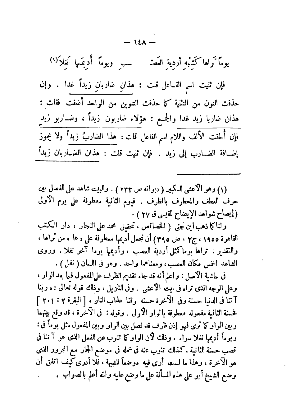 فإن ثنيت اسم الفاعل فلت: هذان ضاربان زيداً غدا. وإن حذفت النون من التثنية كما حذفت التنوين من الواحد أضفت فقلت: هذان ضاربا زيد غدا والجمع: هؤلاء ضاربون زيدا، وضاربو زيد فإن ألحقت الألف واللام اسم الفاعل قلت: هذا الضارب زيدا ولا يجوز إضافة الضارب إلى زيد. فإن ثنيت قلت: هذان الضاربان زيداً