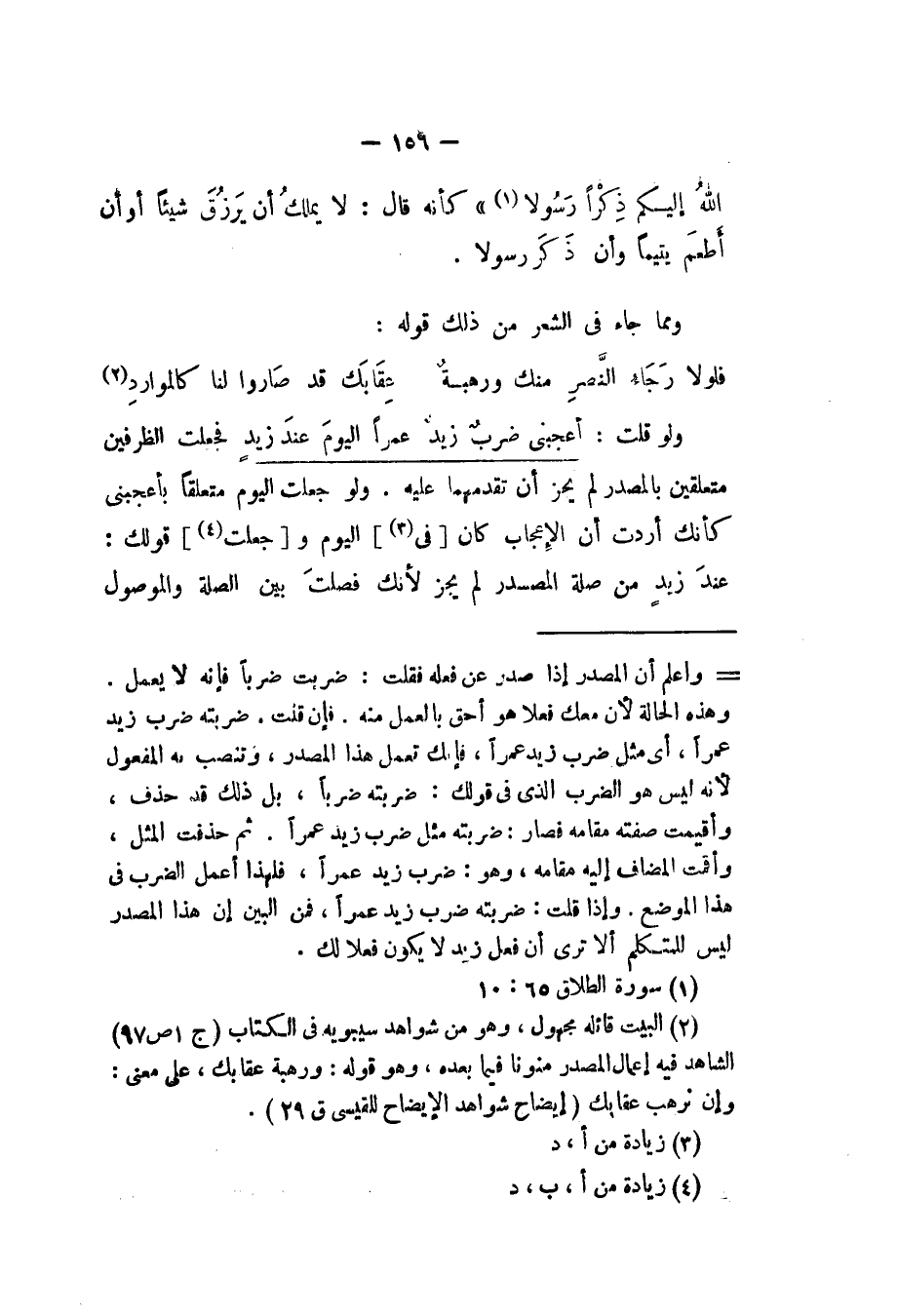 ولو قلت: أعجبني ضرب زيد عمراً اليوم عند زيد فجعلت الظرفين متعلقين بالمصدر لم يحز أن تقدمهما عليه. ولو جعلت اليوم متعلقا بأعجبني كأنك أردت أن الإعجاب كان [في] اليوم و [جعلت] قولك: عند زيد من صلة المصدر لم يجز لأنك فصلت بين الصلة والموصول
