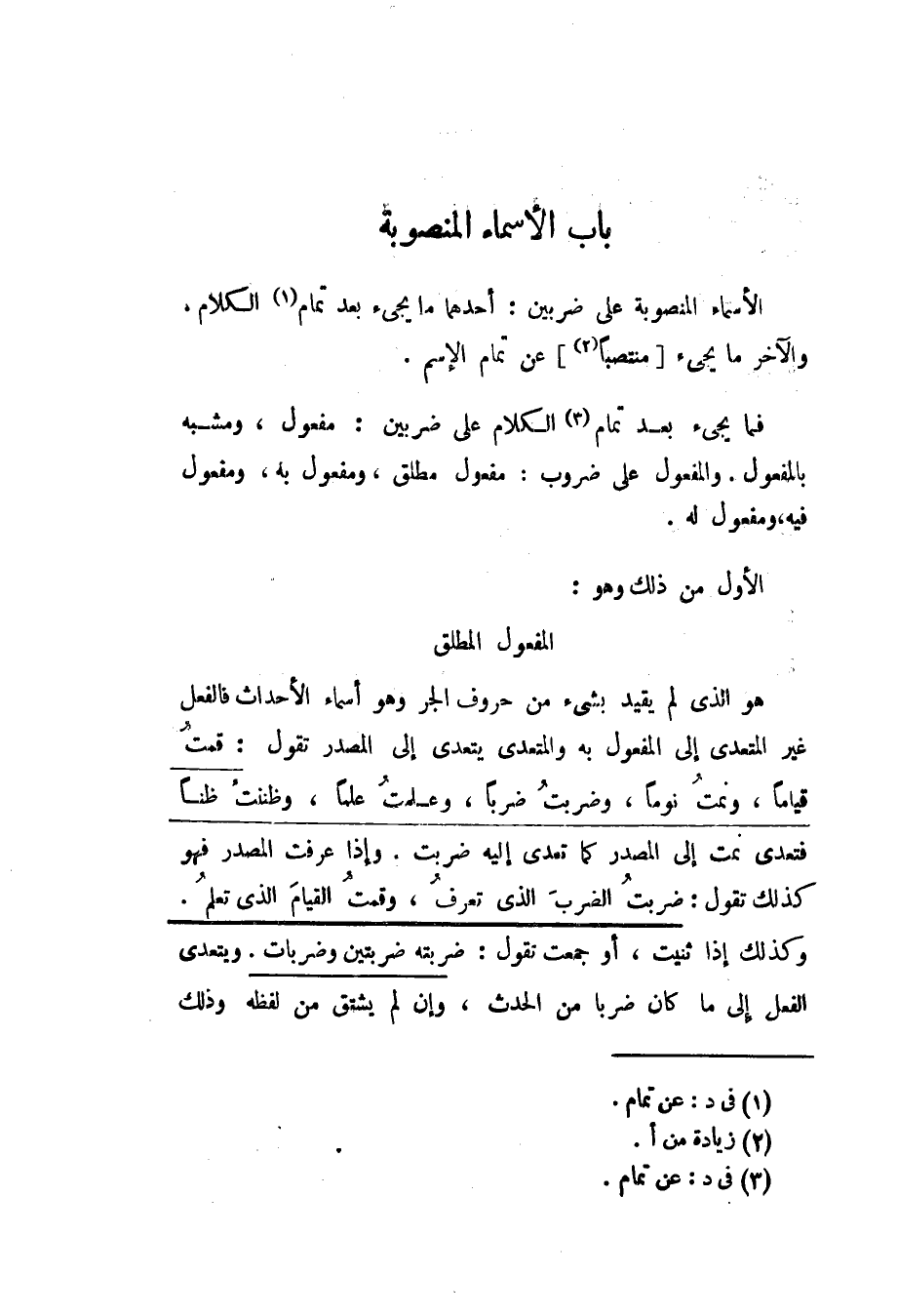 فما يجيء بعد تمام الكلام على ضربين: مفعول، ومشبه بالمفعول. والمفعول على ضروب: مفعول مطلق، ومفعول به، ومفعول فيه، ومفعول له.