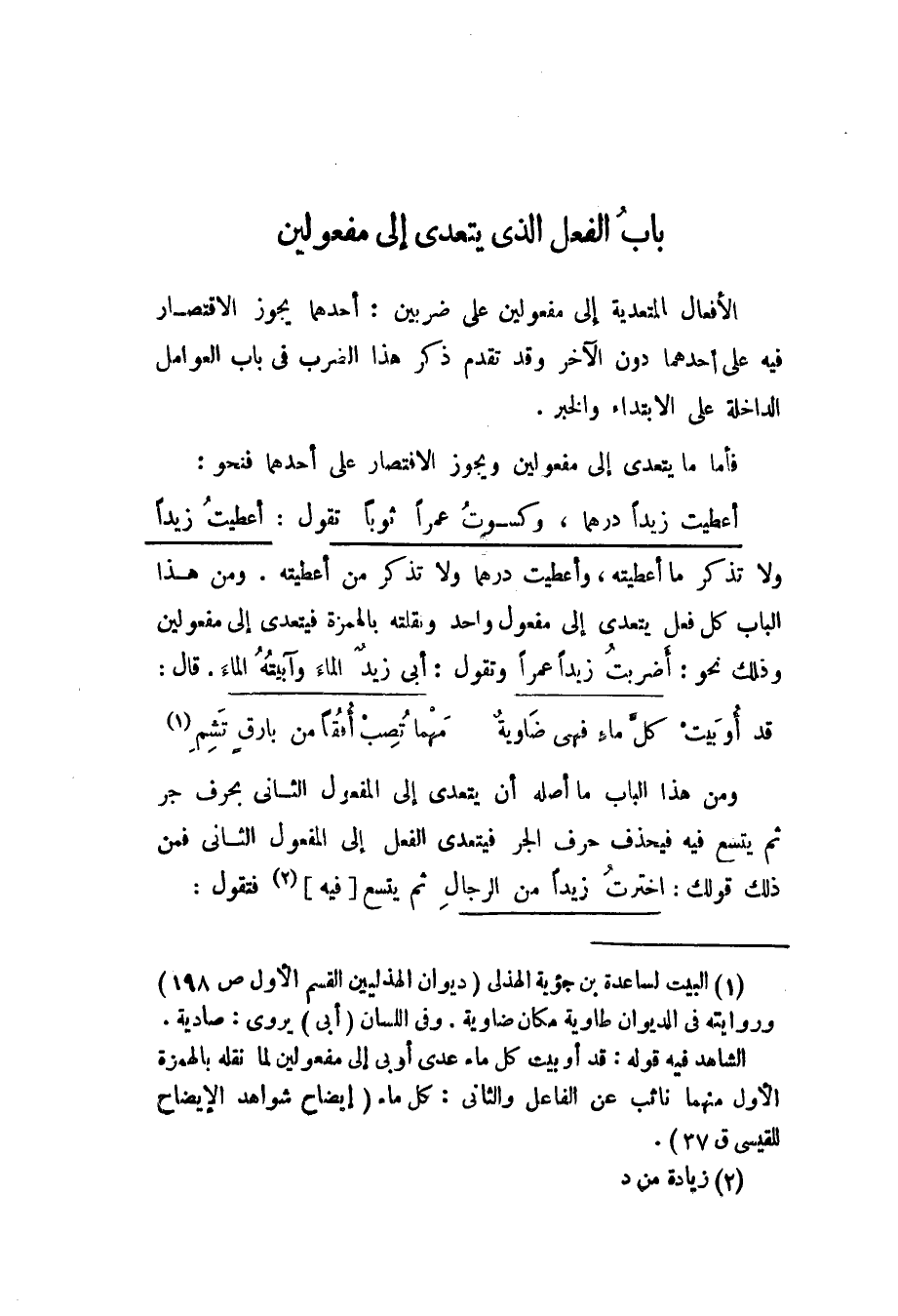 أعطيت زيدا ردهما، وكسوت عمرا ثوبا تقول: " أعطيت زيدا ولا تذكر ما أعطيته، وأعطيت درهما ولا تذكر من أعطيته. ومن هذا الباب كل فعل يتعدى إلى مفعول واحد ونقلته بالهمزة فيتعدى إلى مفعولين وذلك نحو: أضربت زيدا عمراً وتقول: أبي زيد الماء وآبيته الماء. ثال: