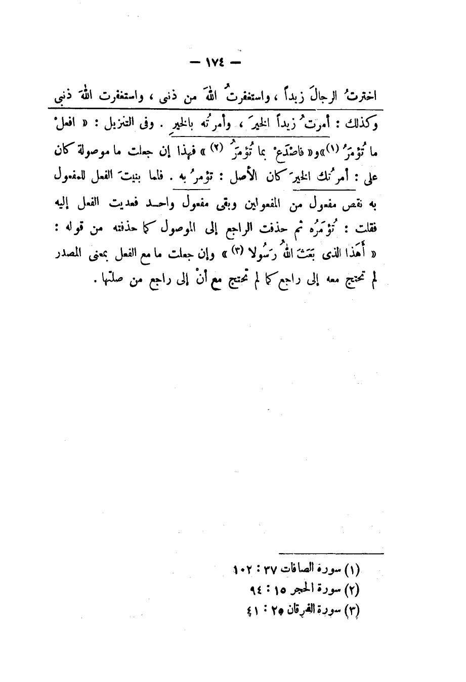 اخترت الرجال زيداً، واستغفرت الله من ذنبي واستغفرت الله ذنبي وكذلك: أمرت زيدا الخيرا، وأمرته بالخير. وفي التنزيل: {افعل ما تؤمر} و {فاصدع بما تؤمر} فهذا إن جعلت ما موصولة كان على: أمرتك الخير كان الأصل: تؤمر به. فلما بنيت الفعل للمفعول به نقص مفعول من المفعولين وبقى مفعول واحد فعديت الفعل إليه فقلت: تؤمره ثم حذفت الراجع إلى الموصول كما حذفته من قوله: