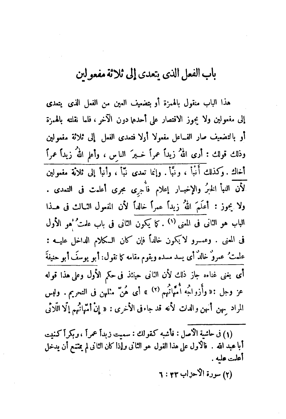 ولا يجوز: أعلم الله زيدا عمرا خالدا لأن المفعول الثالث في هذا الباب هو الثاني في المعنى. كما يكون الثاني في باب علمت هو الأول في المعنة. وعمرو لا يكون خالدا فإن كان الكلام الداخل عليه: علمت عمرو خالد أي يسد مسده ويقوم مقامه كما نقول: أبو يوسف أبو حنيفة أي يغنى غناءه جاز ذلك لأن الثاني حينئذ في حكم الأول وعلى هذا قوله عز وجل: {وأزواجه أمهاتهم} أي هن مثلهن في التحريم. وليس المراد بهن أنهم والدات لأنه قد جاء في الأخرى: {إن أمهاتهم إلا اللائي