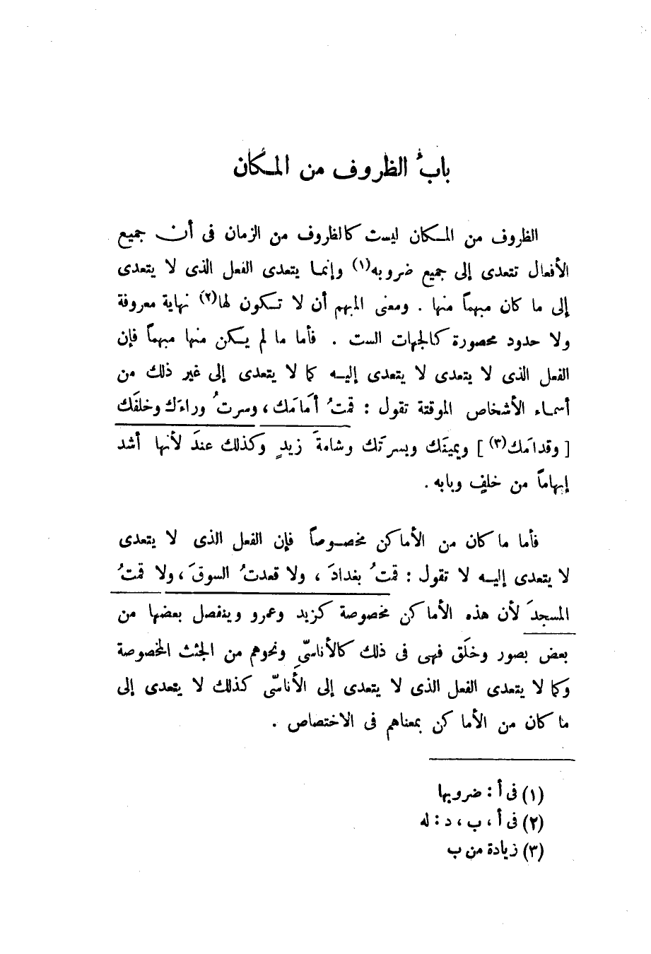 الظروف من المكان ليست كالظروف من الزمان في أن جميع الأفعال تتعدى إلى جميع ضروبه وإنما يتعدى الفعل الذي لا يتعدى إلى ما كان مبهما منها. ومعنى المبهم أن لا تكون لها نهاية معروفة ولا حدود محصورة كالجهات الست. فأما ما لم يكن منها مبهما فأن الفعل الذي لا يتعدى لا يتعدى إليه كما لا يتعدى إلى غير ذلك من أسماء الأشخاص الموقتة تقول: قمت أمامك، وسرت وراءك وخلفك [وقدامك] ويمينك ويسرتك وشامة زيد وكذلك عند لأنها أشد إبهاما من خلف وبابه.