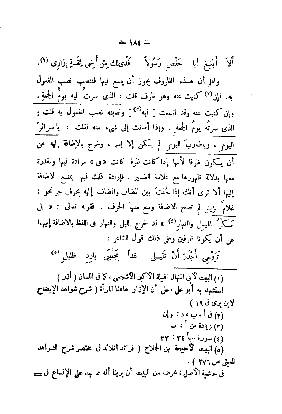 واعلم أن هذه الظروف يجوز أن يتسع فيها فتنصب نصب المفعول به. فإن كنيت عنه وهو ظروف قلت: الذي سرت فيه يوم الجمعة. وإن كنيت عنه وقد اتسعت [فيه] ونصبته نصب المفعول به قلت: الذي سرته يوم الجمعة. وإذا أضفت إلى شيء منه فقلت: يا سرائر اليوم، وياضارب اليوم لم يكن إلا إسما، وخرج بالإضافة إليه عن أن يكون ظرفا لأنها إذا كانت ظرفا كانت"في" مرادة فيها ومقدرة معها بدلالة ظهورها مع علامة الضمير. فإرادة ذلك فيها يمنع الإضافة إليها ألا ترى أنك إذا حلت بين المضاف والمضاف إليه بحرف جر نحو: غلام لزيد لم تصح الإضافة ومنع منها الحرف. فقوله تعالى: "بل مكر الليل والنهار" قد خرج الليل والنهار في اللفظ بالإضافة إليها عن أن يكون ظرفين وعلى ذلك قول الشاعر:
