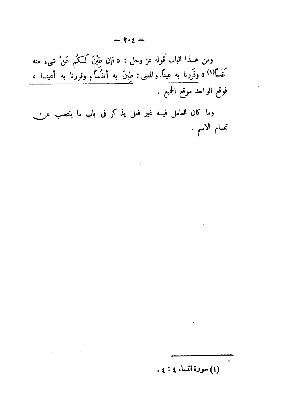 ومن هذا الباب قوله عز وجل: {فإن طبن لكم عن شيءٍ منه نفساً} [النساء: 4] وقررنا به عيناً. والمعنى: طبن به أنفساً؛ وقررنا به أعينا، فوقع الواحد موقع الجميع.