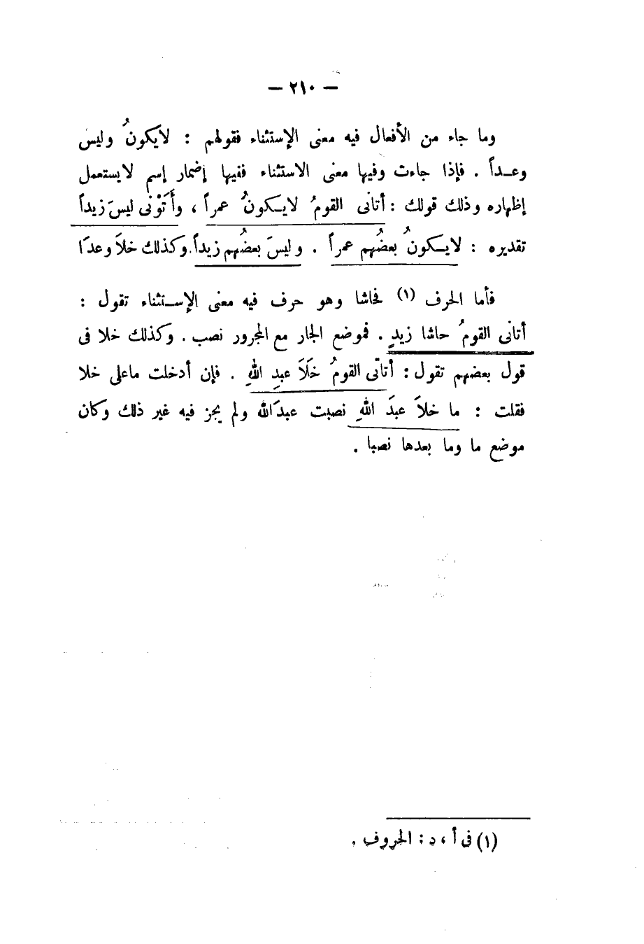 وما جاء من الأفعال فيه معنى الإستثناء فقولهم: لا يكون وليس وعداً. فإذا جاءت وفيها معنى الاستثناء ففيها إضمار إسم لا يستعمل إظهاره وذلك قولك: أتانى القوم لا يكون عمراً، وأتونى ليس زيداً تقديره: لا يكون بعضهم عمراً. وليس بعضهم زيداً. وكذلك خلا وعدا.