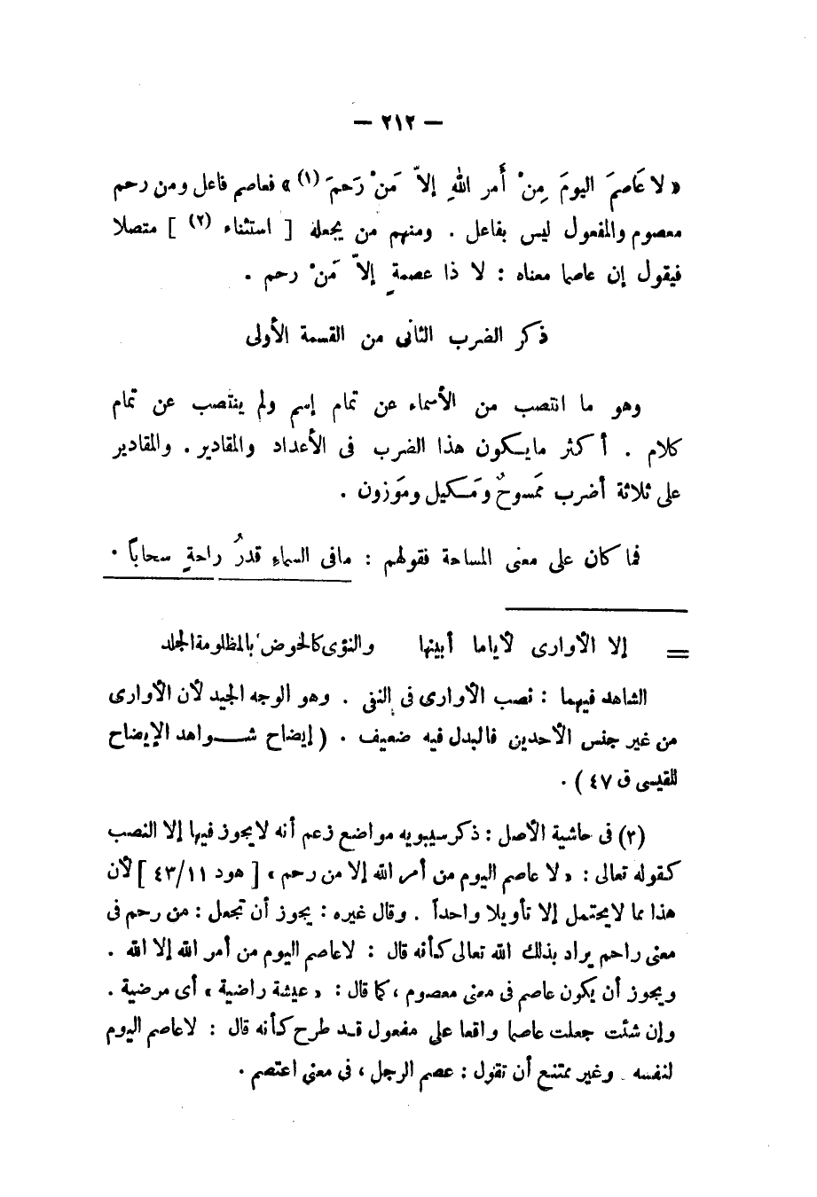 {لا عاصم اليوم من أمر الله إلا من رحم} فعاصم فاعل ومن رحم معصوم والمفعول ليس بفاعل. ومنهم من يجعله [استثناء] متصلا فيقول إن عاصما معناه: لا ذا عصمةٍ إلا من رحم.