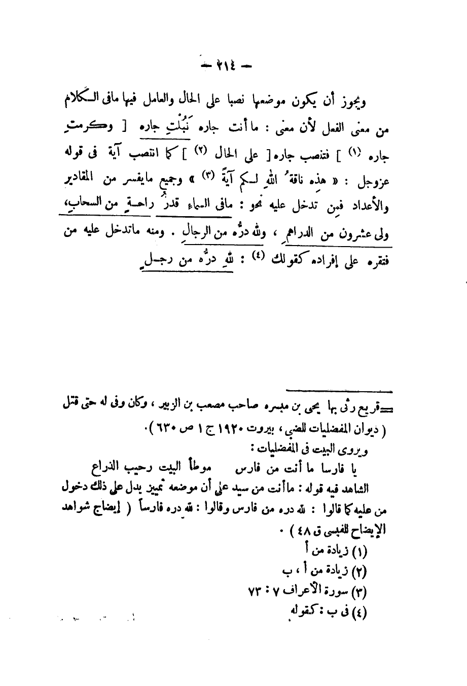 ويجوز أن يكون موضعها نصبا على الحال والعامل فيها ما في الكلام من معنى الفعل لأن معنى: ما أنت جاره نبلت جاره [وكرمت جاره] فتنصب جاره [على الحال] كما انتصب آية في قوله عز وجل: {هذه ناقة الله لكم آية} [الأعراف: 7 - 73] وجميع ما يفسر من المقادير والأعداد فمن تدخل عليه نحو: ما في السماء قدر راحةٍ من السحاب، ولي عشرون من الدراهم، ولله دره من الرجال. ومنه ما تدخل عليه من فتقره على إفراده كقولك: لله دره من رجلٍ