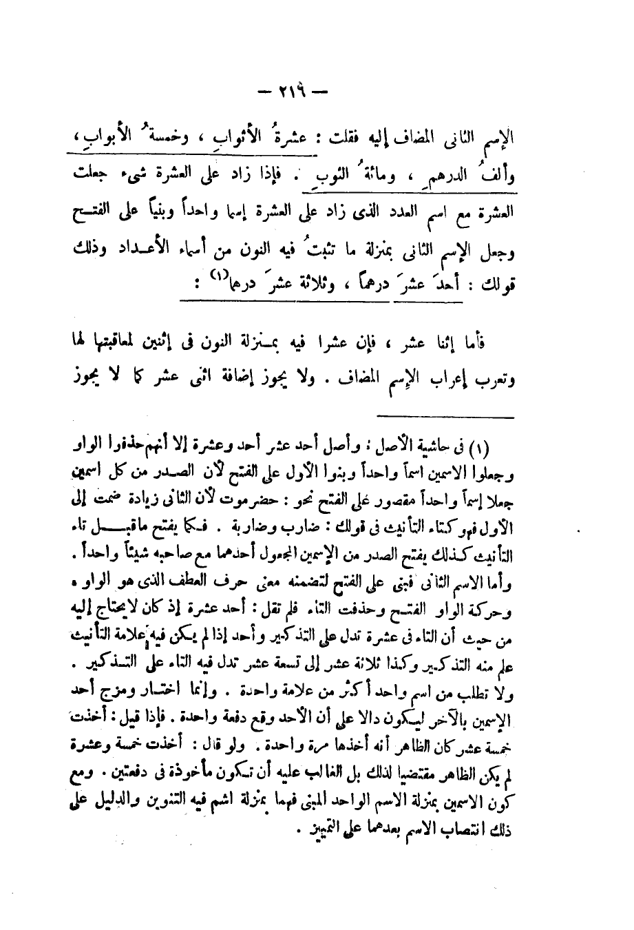 الإسم الثاني المضاف إليه فقلت: عشرة الأثواب، وخمسة الأبواب، وألف الدرهم، ومائة الثوب. فإذا زاد على العشرة شيء جعلت العشرة مع اسم العدد الذي زاد على العشرة إسما واحداً وبنياً على الفتح وجعل الإسم الثاني بمنزلة ما تثبت فيه النون من أسماء الأعداد وذلك قولك: أحد عشر درهماً، وثلاثة عشر درهما: