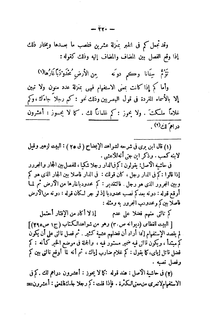 وقد تجعل كم في الخبر بمنزلة عشرين فتنصب ما بعدها ويختار ذلك إذا وقع الفصل بين المضاف والمضاف إليه وذلك كقوله: