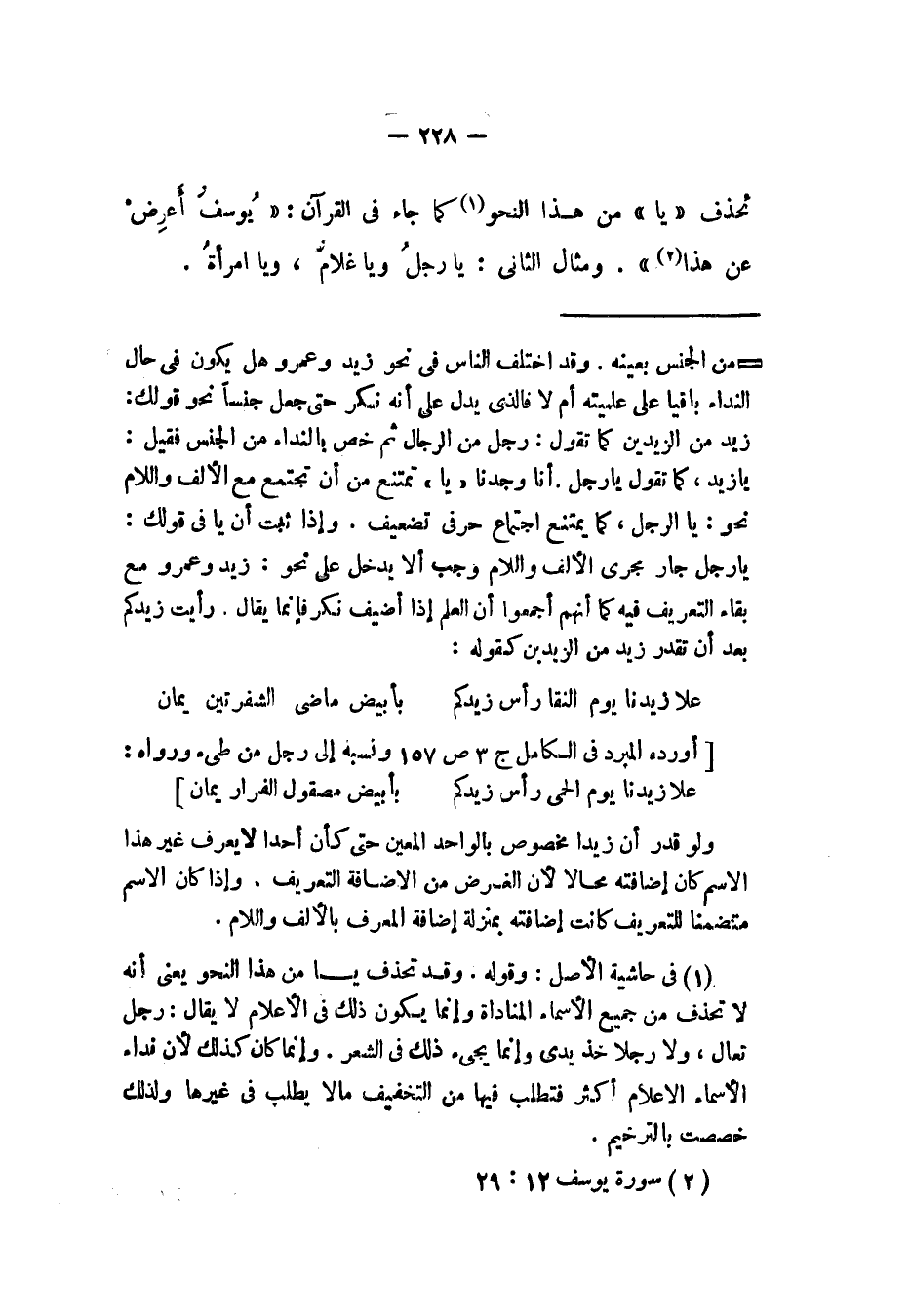 وأما المعرفة فعلى ضربين أحدهما ما كان معرفة قبل النداء والآخر ما كان متعرفا في النداء لتوجه الخطاب إليه وتخصيصه به من بين جنسه. وكلا الضربين مبنى على الضم. فمثال الأول يا زيد، ويا عمرو، وقد