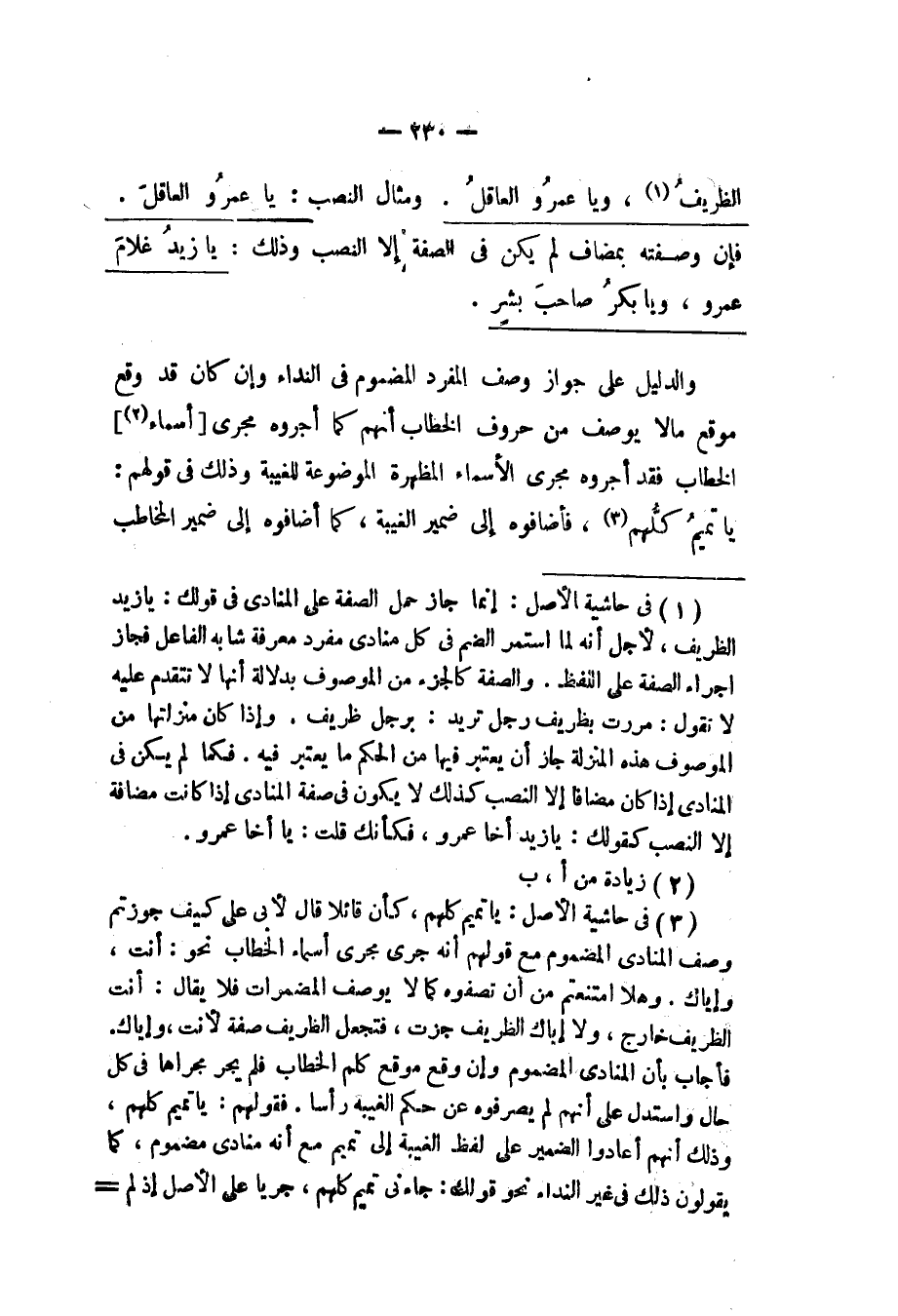 فهذان الضربان بنيا على الضم لوقوعهما موقع أسماء الخطاب. وأسماء الخطاب يغلب عليها معاني الحروف بدلالة أن كل موضع تقع فيه أسماء يكون فيها دلالات على الخطاب. وقد تكون للخطاب مجردة من معاني الأسماء وذلك مثل الكاف في ذلك، وأولئك وهنالك والنجاك، والتاء في أنت. فلما وقعت هذه الأسماء في النداء مواقع الحروف، وما يغلب عليه شبه الحروف بنيت.