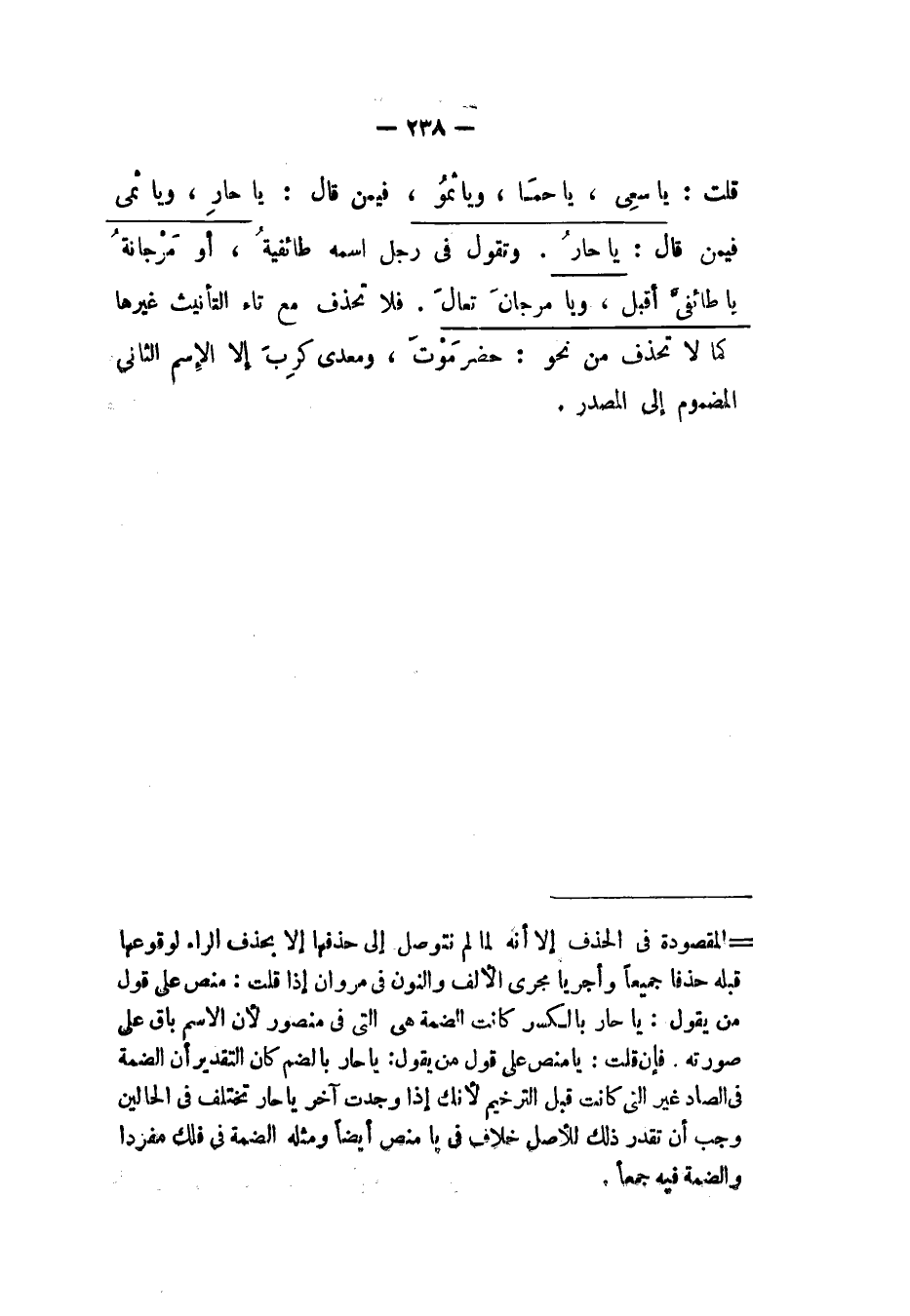 والآخر أن تجعله بمنزلة اسم مفرد لم يحذف منه شيء. فمثال الأول أن تقول في حارثٍ، مالكٍ، وجعفرٍ، وبرثن وهرقل: يا حار، ويا جعف، ويا برث، ويا هرق أقبل. وتضم هذه الحروف كلها في القول الثاني. فإن كان في آخر اسم زيادتان زيدتا معاً حذفتهما معاً وذلك قولك في رجل اسمه مروان وسعدان: يا مرو أقبل، ويا سعد أقبل. فإن كان قبل آخر الإسم حرف مد زائد أتبعته الزائد في الحذف إذا كان الإسم على أكثر من ثلاثة أحرف فقلت في رجل اسمه منصور: يا منص. فإن كان اسمه سعيد، أو ثمود، أو حمار