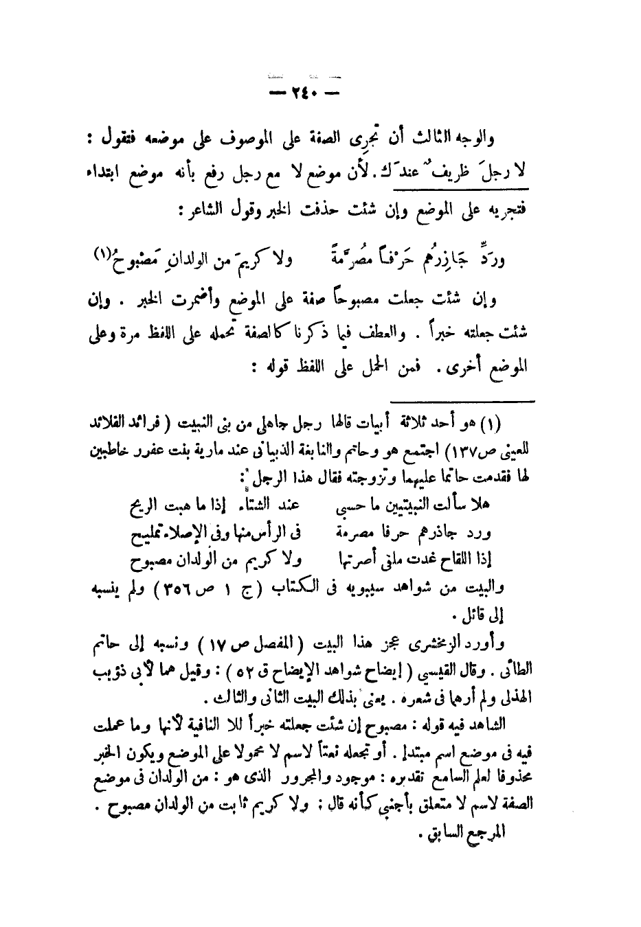 والمنفي في هذا الباب ينقسم ثلاثة أقسام. مفرد، ومضاف، ومضارع للمضاف. فالمفرد على ضربين مفرد غير موصوف ومفرد موصوف. فالمفرد غير الموصوف نحو ما ذكرنا. والمفرد الموصوف يجرى إذا وصف على ثلاثة أضرب: