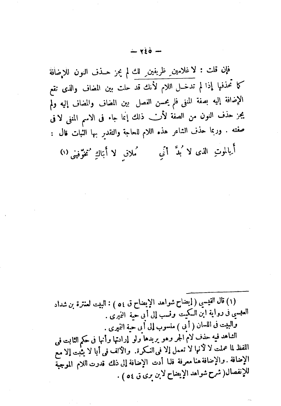 فإن قلت: لا غلامين ظريفين لك لم يجز حذف النون للإضافة كما تحذفها إذا لم تدخل اللام لأنك قد حلت بين المضاف والذي تقع الإضافة إليه بصفة المنفى فلم يحسن الفصل بين المضاف والمضاف إليه ولم يجز حذف النون من الصفة لأن ذلك إنما جاء في الاسم المنفي لا في صفته. وربما حذف الشاعر هذه اللام للحاجة والتقدير بها الثبات قال: