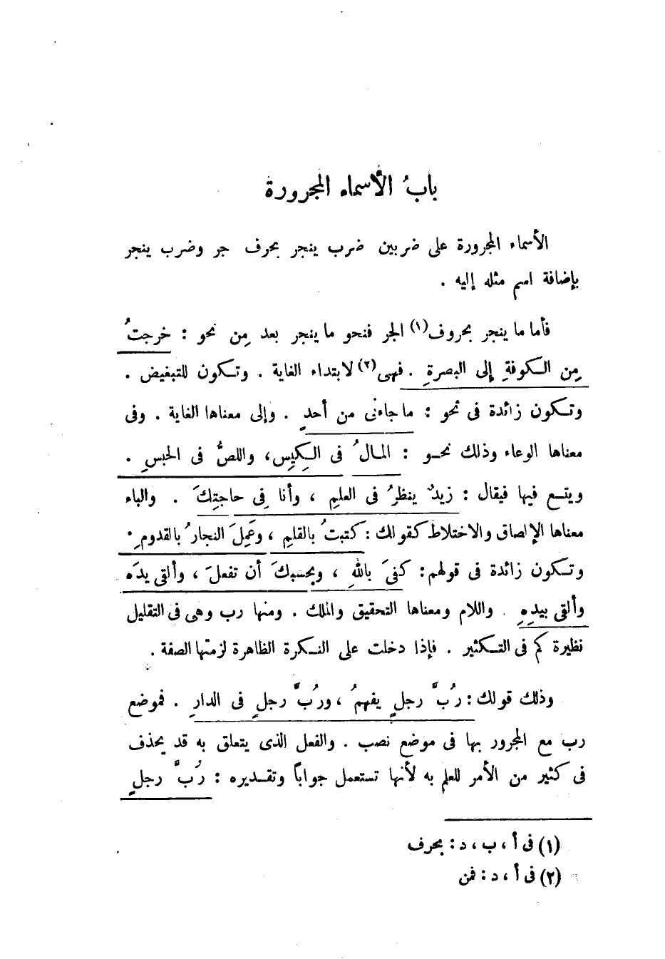 وتكون زائدة في نحو: ما جاءني من أحدٍ. وإلى معناها الغاية. وفي معناها الوعاء وذلك نحو: المالُ في الكِيِس، واللص في الحبسِ. ويتسع فيها فيقال: زيدٌ ينظرُ في العلم، وأنا في حاجتكَ. والباء معناها الإلصاق والاختلاط كقولك: كتبتُ بالقلم، وعمل النجار بالقدوم. وتكون زائدة في قولهم: كفى بالله، وبحسبك أن تفعل، وألقى يده وألقى بيده. واللام ومعناها التحقيق والملك. ومنها رب وهي في التقليل نظيره كم في التكثير. فإذا دخلت على النكرة الظاهرة لزمتها الصفة.