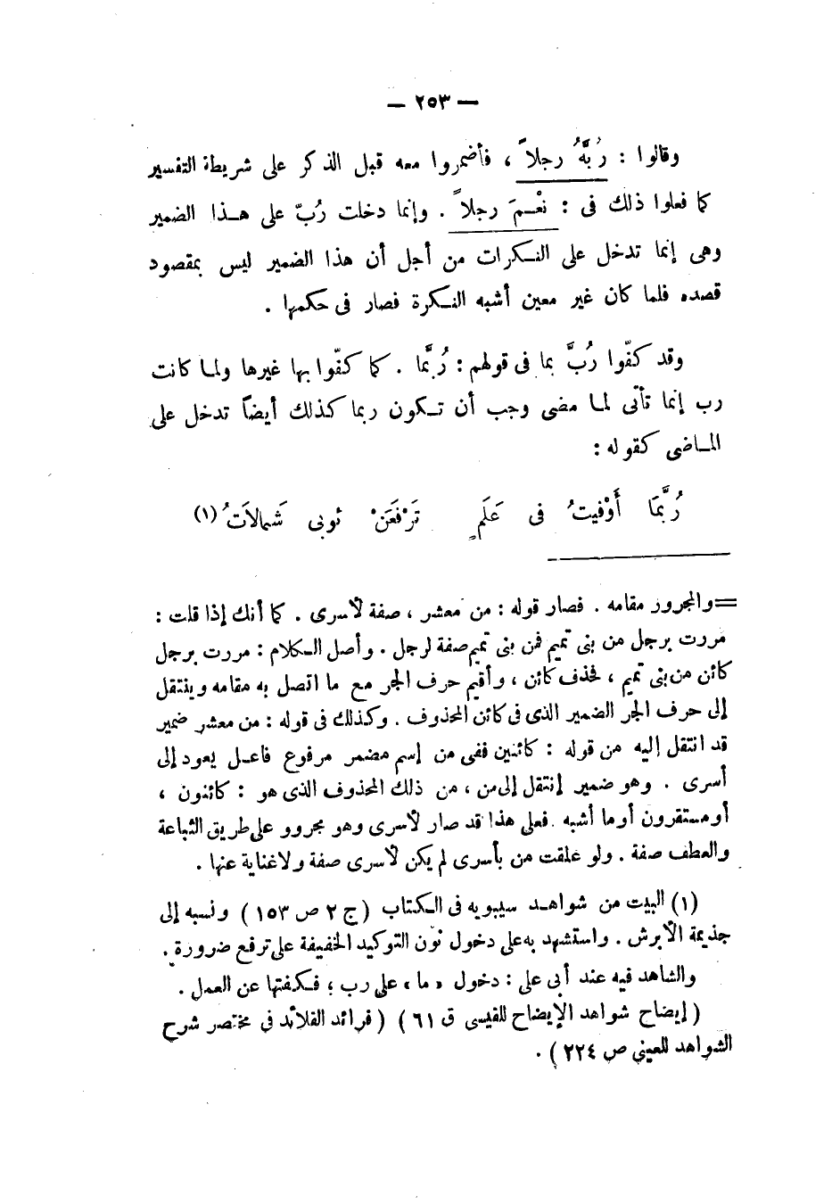وقالوا: ربه رجلًا، فأضمروا معه قبل الذكر على شريطة التفسير كما فعلوا ذلك في: نعم رجلًا. وإنما دخلت رب على هذا الضمير وهي إنما تدخل على النكرات من أجل أن هذا الضمير ليس بمقصود قصده فلما كان غير معين أشبه النكرة فصار في حكمها.