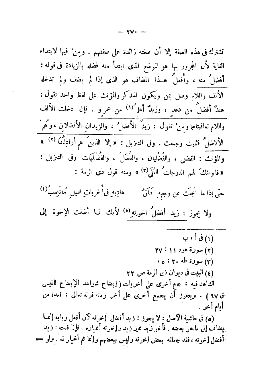 تشترك في هذه الصفة إلا أن صفته زائدة على صفتهم. ومن فيها لابتداء الغاية لأن المجرور بها هو الموضع الذي ابتدأ منه فضله بالزيادة في قوله: أفضل منه، وأفعل هذا المضاف هو الذي إذا لم يضف ولم تدخله الألف واللام وصل بمن ويكون للمذكر والمؤنث على لفظ واحد تقول: هندٌ أفضل من دعدٍ، وزيدٌ أعلم من عمروٍ. فإن دخلت الألف واللام تعاقبتاهما ومن تقول: زيدٌ الأفضل، والزيدان الأفضلان، وهم الأفاضل فثنيت وجمعت. وفي التنزيل: {إِلَّا الَّذِينَ هُمْ أَرَاذِلُنَا} [هود: 27] والمؤنث: الفضلى، والفضليان، والفضل، والفضليات وفي التنزيل: {فَأُوْلَئِكَ لَهُمُ الدَّرَجَاتُ الْعُلى} [طه: 75] ومنه قول ذي الرمة: