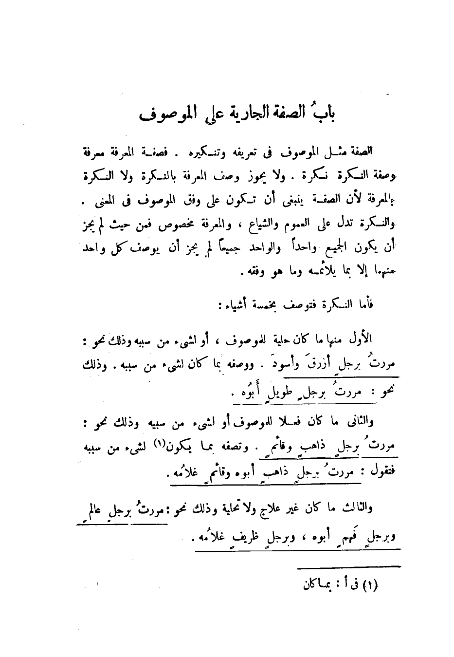 الصفة مثل الموصوف في تعريفه وتنكيره. فصفة المعرفة معرفة وصفة النكرة نكرة. ولا يجوز وصف المعرفة بالنكرة ولا النكرة بالمعرفة لأن الصفة ينبغي أن تكون على وفق الموصوف في المعنى. والنكرة تدل على العموم والشياع، والمعرفة مخصوص فمن حيث لم يجز أن يكون الجميع واحداً والواحد جميعاً لم يجز أن يوصف كل واحد منهما إلا بما يلائمه وما هو وفقه. فأما النكرة فتوصف بخمسة أشياء: الأول منها ما كان حلية للموصوف، أو لشيء من سببه وذلك نحو: مررت برجل أزرق وأسود. ووصفه بما كان لشيء من سببه. وذلك نحو: مررت برجل طويل أبوه.
