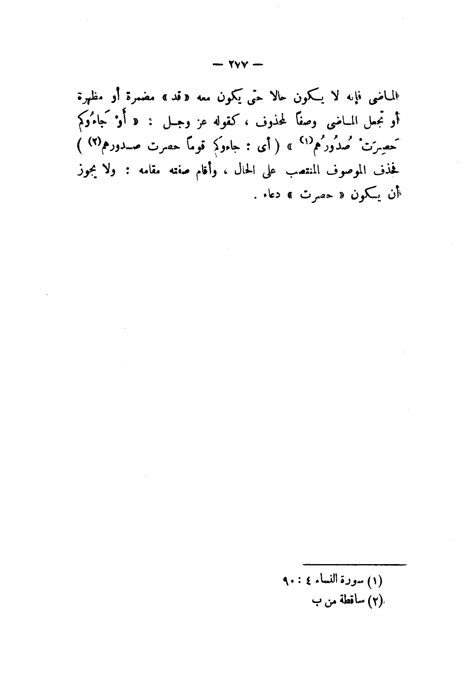 الماضي فإنه لا يكون حالا حتى يكون معه «قد» مضمرة أو مظهرة أو تجعل الماضي وصفاً لمحذوف، كقوله عز وجل: {أَو جَاءُكُم حَصِرَتْ صَدُورُهم} (أي: جاءوكم قوماً حصرت صدورهم) فحذف الموصوف المنتصب على الحال، وأقام صفته مقامه: ولا يجوز أن يكون «حصرت» دعاء.