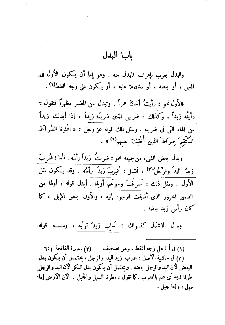 والبدل يعرب بإعراب المبدل منه. وهو إما أن يكون الأول في المعنى، أو بعضه، أو مشتملا عليه، أو يكون على وجه الغلط. فالأول نحو: رأيت أخاك عمراً. وتبدل من المضر مظهراً فتقول: رأيته زيداً، وكذلك: ضربني الذي ضربته زيداً، إذا أبدلت زيداً من الهاء التي في ضربته. ومثل ذلك قوله عز وجل: {اهدِنَا الصِّرَاطَ المُستَقِيمَ صِرَاطَ الَّذِينَ أَنعَمتَ عَلَيهِمْ}. وبدل بعض الشيء من جميعه نحو: ضربت زيداً رأسه. فأما: ضرب زيدٌ اليد والرجل، فمثل: ضرب زيدٌ رأسه. وقد يكون المثل الأول. ومثل ذلك: صرفت وجوهها أولها. أبدل قوله: أولها من الضمير المجرور الذي أضيفت الوجوه إليه، والأول بعض الإبل، كما كان رأس زيد بعضه. وبدل الاشتمال كقولك: سلب زيدٌ ثوبه، ومنه قوله