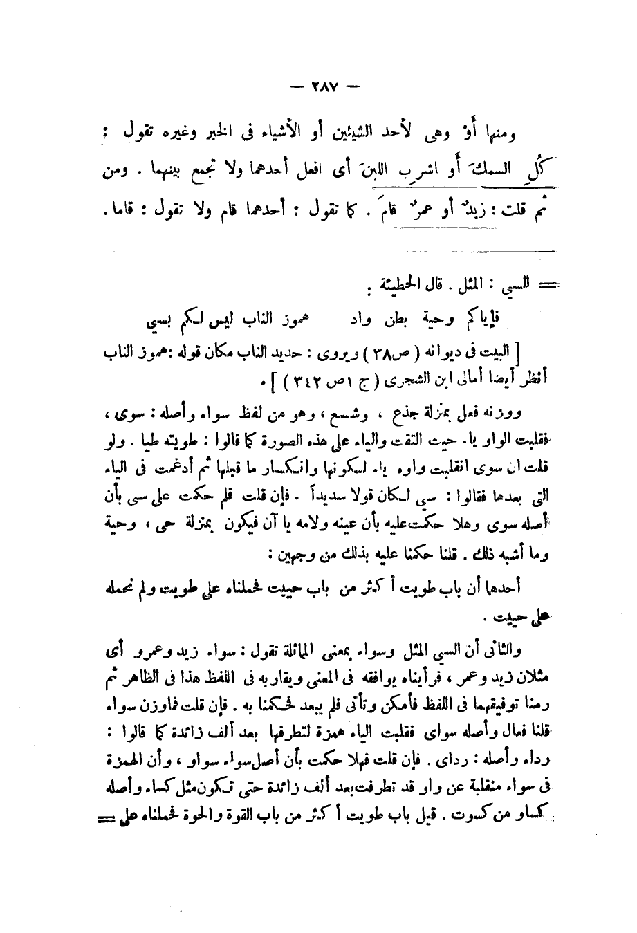 ومنها أو وهي لأحد الشيئين أو الأشياء في الخبر وغيره تقول: كل السمك أو اشرب اللبن أي افعل أحدهما ولا تجمع بينهما. ومن ثم قلت: زيدٌ أو عمرٌ قام. كما تقول: أحدهما قام ولا تقول: قاما.