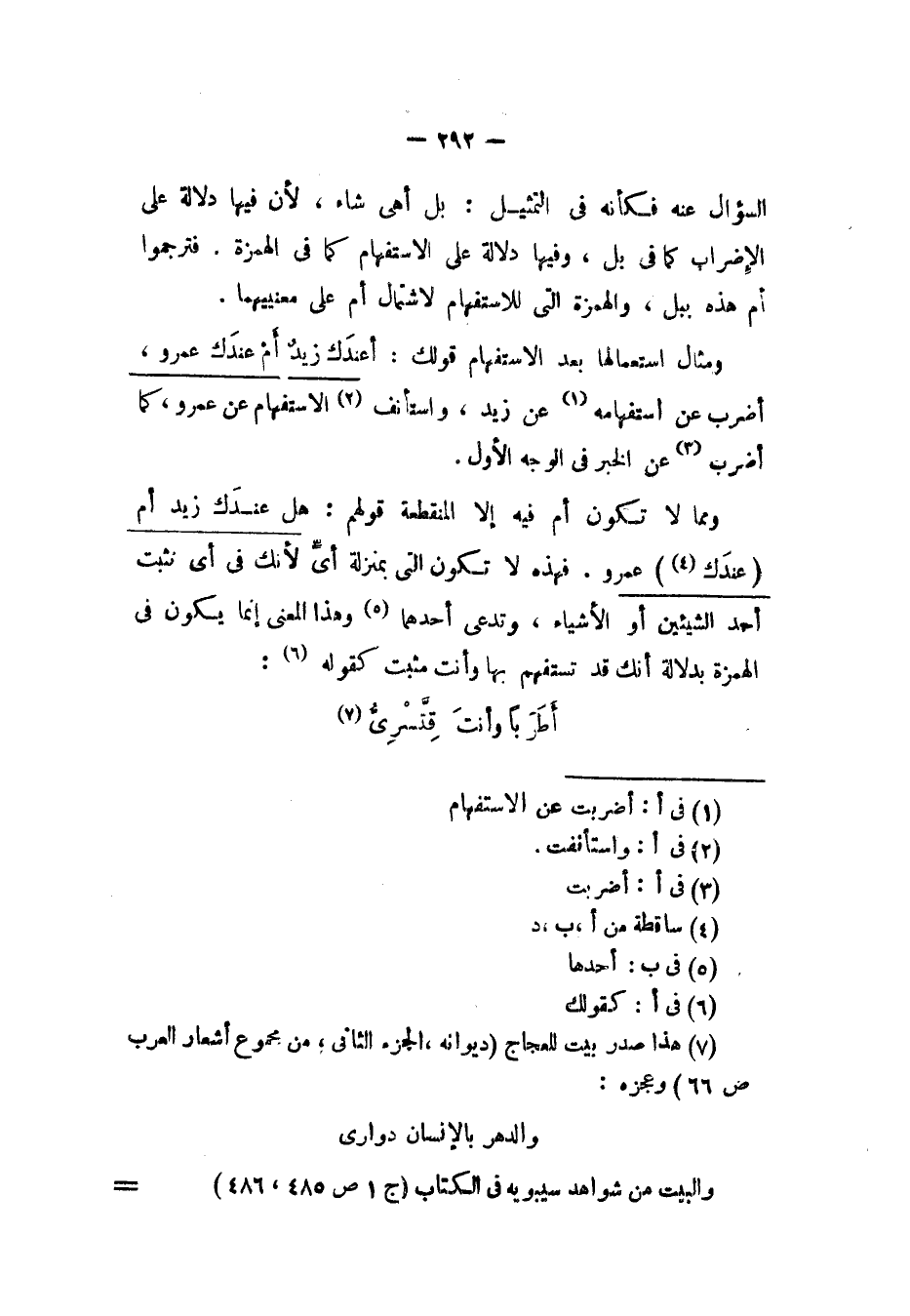 السؤال عنه فكأنه في التمثيل: بل أهي شاء، لأن فيها دلالة على الإضراب كما في بل، وفيها دلالة على الاستفهام كما في الهمزة. فترجموا أم هذه ببل، والهمزة إلى للاستفهام لاشتمال أم على معنييهما. ومثال استعمالها بعد الاستفهام قولك: أعندك زيد أم عندك عمرو، أضرب عن استفهامه عن زيد، واستأنف الاستفهام عن عمرو، كما أضرب عن الخبر في الوجه الأول. ومما لا تكون أم فيه إلا المنقطعة قولهم: هل عند زيد أم (عندك) عمرو. فهذه لا تكون التي بمنزلة أي لأنك في أي نثبت أحد الشيئين أو الأشياء، وتدعى أحدهما وهذا المعنى إنما يكون في الهمزة بدلالة أنك قد تستفهم بها وأنت مثبت كقوله: أطرباً وأنت قنسري