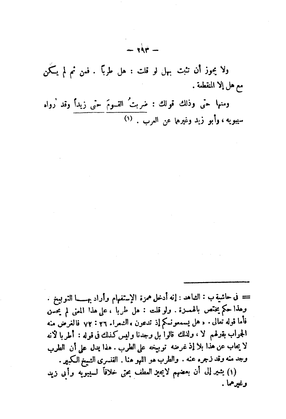 ولا يجوز أن تثبت بهل لو قلت: هل طرباً. فمن ثم لم يكن مع هل إلا المنقطعة. ومنها حتى وذلك قولك: ضربت القوم حتى زيداً وقد رواه سيبويه، وأبو زيد وغيرهما عن العرب.