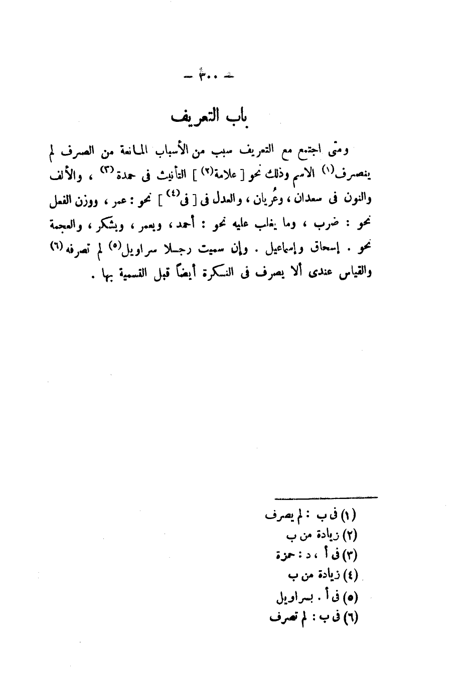 ومتى اجتمع مع التعريف سبب من الأسباب المانعة من الصرف لم ينصرف الاسم وذلك نحو [علامة] التأنيث في حمدة، والألف والنون في سعدان، وعريان، والعدل في [في] نحو: عمر، ووزن الفعل نحو: ضرب، وما يغلب عليه نحو: أحمد، وبعمر، وبشكر، والعجمة نحو. إسحاق وإسماعيل. وإن سميت رجلا سراويل لم تصرفه والقياس عندي ألا يصرف في النكرة أيضاً قبل التسمية بها.