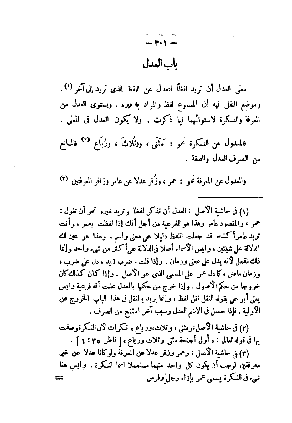 معنى العدل أن تريد لفظاً فتعدل عن اللفظ الذي تريد إلى آخر. وموضع النقل فيه أن المسموع لفظ والمراد به غيره. ويستوي العدل من المعرفة والنكرة لاستوائهما فيما ذكرت. ولا يكون العدل في المعنى. فالمعدول عن النكرة نحو: مثنى، وثلاث، ورباع فالمانع من الصرف العدل والصفة. والمعدول عن المعرفة نحو: عمر، وزفر عدلا عن عامر وزافر المعرفتين