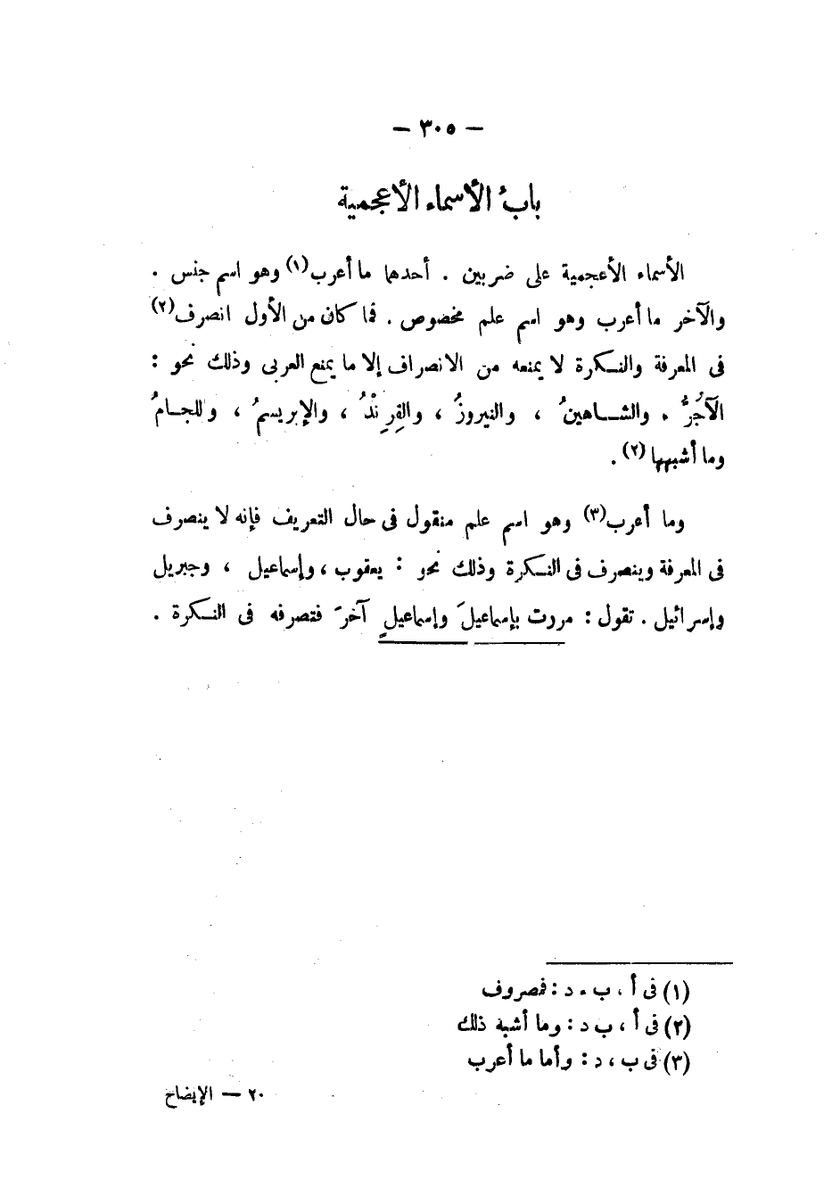 الأسماء الأعجمية على ضربين. أحدهما ما أعرب وهو اسم جنس. والآخر ما أعرب وهو اسم علم مخصوص. فما كان من الأول انصرف في المعرفة والنكرة لا يمنعه من الانصراف إلا ما يمنع العربي وذلك نحو: الآجر, والشاهين, والنيروز, والقرند, والإبريسم, واللجام وما أشبهها. وما أعرب وهو اسم علم منقول في حال التعريف فإنه لا ينصرف في المعرفة وينصرف في النكرة وذلك نحو: يعقوب, وإسماعيل, وجبريل وإسرائيل. تقول: مررت بإسماعيل وإسماعيل آخر فتصرفه في النكرة.