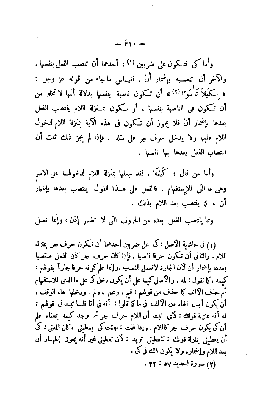 وأما كي فتكون على ضربين: أحدهما أن تنصب الفعل بنفسها. والآخر أن تنصبه بإضمار أن. فقياس ما جاء من قوله عز وجل: {لِكَيْلا تَأْسَوْا} أن تكون ناصبة بنفسها بدلالة أنها لا تخلو من أن تكون هي الناصبة بنفسها، أو تكون بمنزلة اللام ينتصب الفعل بعدها بإضمار أن فعلا يجوز أن تكون في هذه الآية بمنزلة اللام لدخول اللام عليها ولا يدخل حرف جر على مثله. فإذا لم يجز ذلك ثبت أن انتصاب الفعل بعدها بها نفسها. وأما من قال: كيمه. فقد جعلها اللام لدخولها على الاسم وهي ما التي للاستفهام. فالفعل على هذا القول ينتصب بعدها بإضمار أن، كما ينتصب بعد اللام بذلك. ومما ينتصب الفعل بعده من الحروف التي لا تضمر إذن، وإنما تعمل