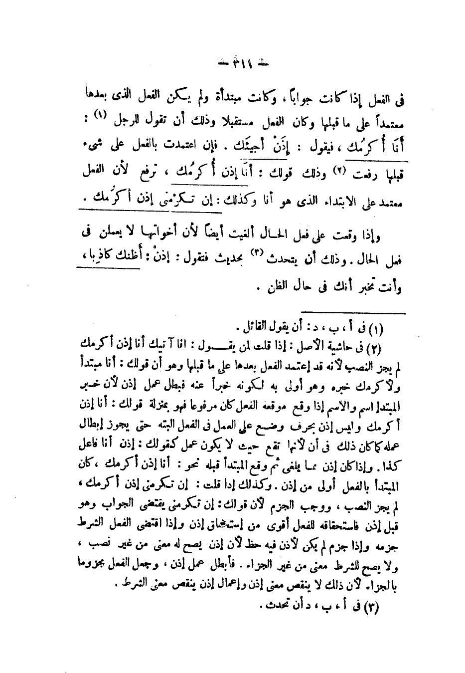 في الفعل إذا كانت جواباً، وكانت مبتدأة ولم يكن الفعل الذي بعدها معتمداً على ما قبلها وكان الفعل مستقبلا وذلك أن تقول للرجل: أنا أكرمك، فيقول: إذن أجيئك. فإن اعتمدت بالفعل على شيء قبلها رفعت وذلك قولك: أنا إذن أكرمك، ترفع لأن الفعل معتمد على الابتداء الذي هو أنا وكذلك: وإن تكرمني إذن أكرمك. وإذا وقعت على فعل الحال ألغيت أيضاً لأن أخواتها لا يعملن في فعل الحال. وذلك أن يتحدث بحديث فتقول: إذن: أظنك كاذباً، وأنت تخبر أنك في حال الظن.