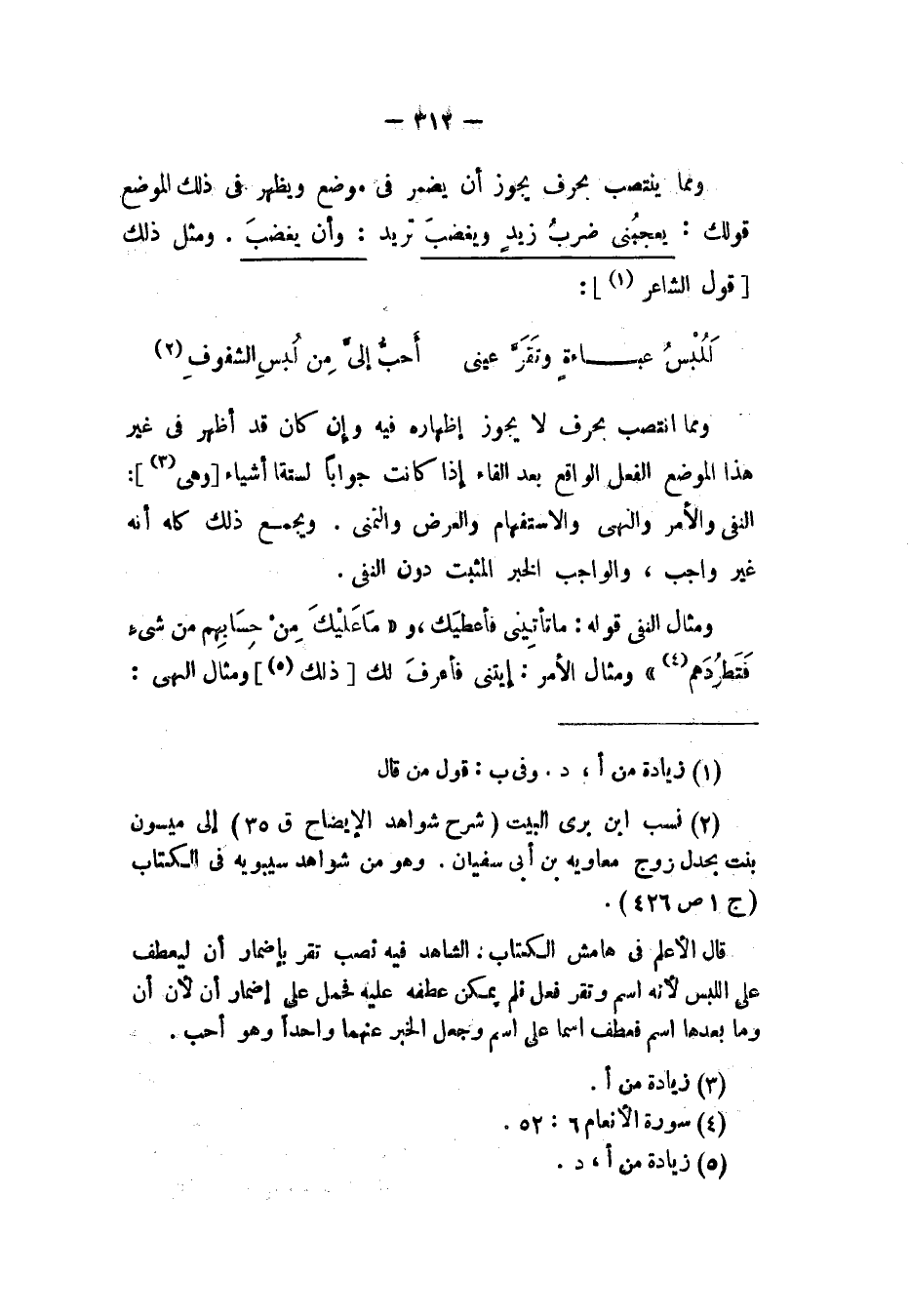 ومما ينتصب بحرف يجوز أن يضمر في موضع ويظهر في ذلك الموضع قولك: يعجبني ضرب زيد ويغضب تريد: وأن يغضب. ومثل ذلك [قول الشاعر]: