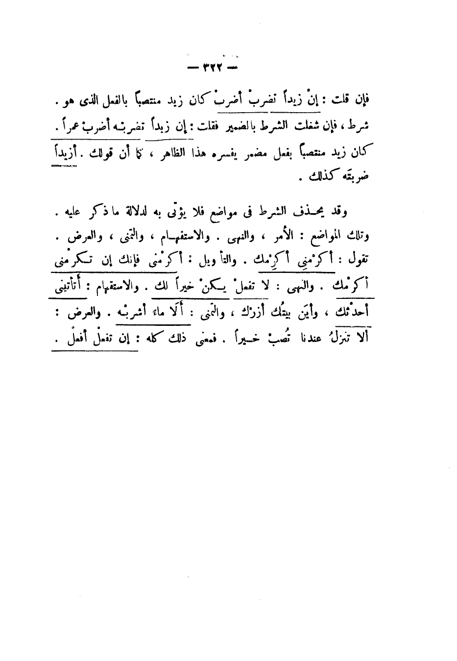 فإن قلت: إن زيداً تضرب أضرب كان زيد منتصباً بالفعل الذي هو. شرط، فإن شغلت الشرط بالضمير فقلت: إن زيداً تضربه أضرب عمراً. كان زيد منتصباً بفعل مضمر يفسره هذا الظاهر، كما أن قولك. أزيداً ضربته كذلك. وقد يحذف الشرط في مواضع فلا يؤتى به لدلالة ما ذكر عليه. وتلك المواضع: الأمر، والنهي، والاستفهام، والتمني، والعرض. تقول: أكرمني أكرمك. والتأويل: أكرمني فإنك إن تكرمني أكرمك. والنهي: لا تفعل يكن خيراً لك. والاستفهام: أتأتيني أحدثك، وأين بيتك أزرك، والتمني: ألا ماء أشربه. والعرض: ألا تنزل عندنا تصب خيراً. فمعنى ذلك كله: إن تفعل أفعل.