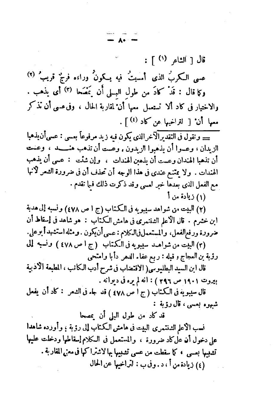 عسى الكرب الذي أمسيت فيه يكون وراءه فرج قريب وكما قال: قد كاد من طول البلى أن يمصحا أي يذهب. والاختيار في كاد ألا تستعمل معها أن لمقاربة الحال، وفي عسى أن تذكر معها أن [لتراخيها عن كاد].