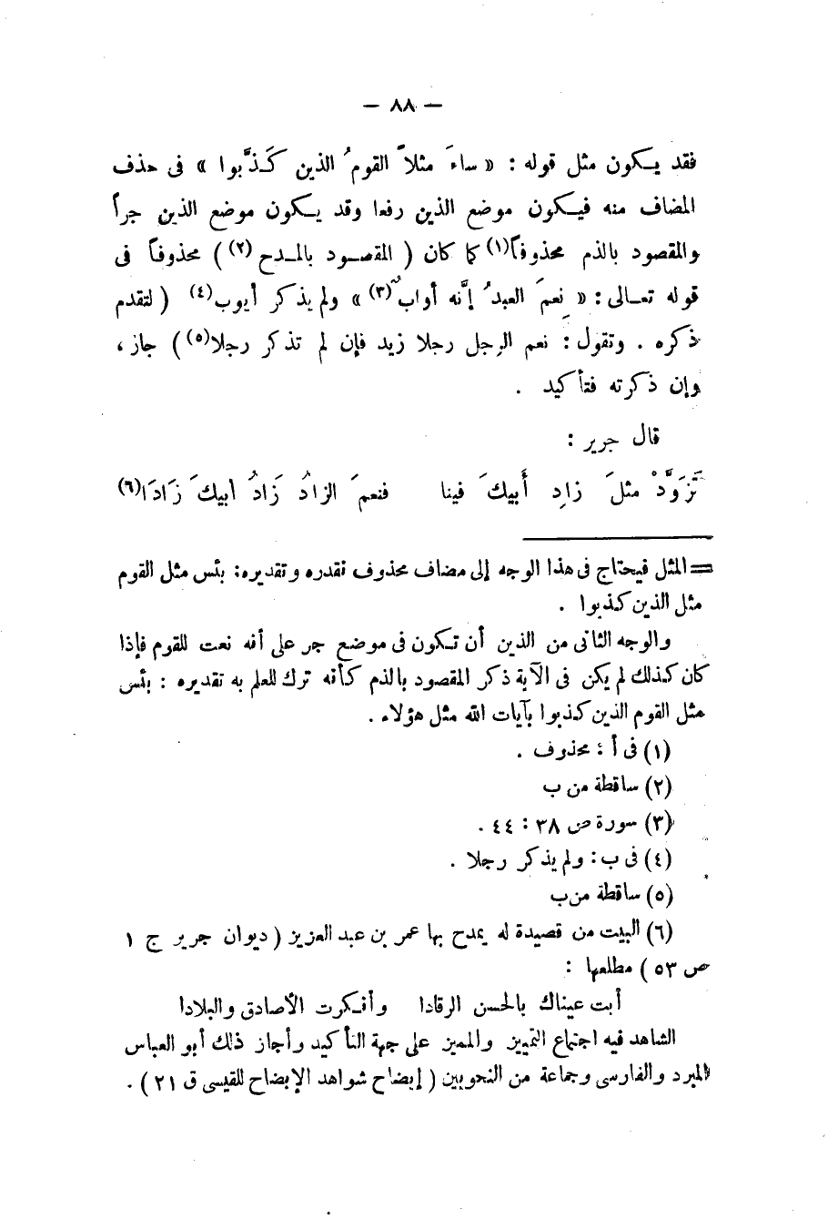 فقد يكون مثل قوله: {ساء مثلا القوم الذين كذبوا} في حذف المضاف منه فيكون موضع الذين رفعا وقد يكون موضع الذين جرا والمقصود بالذم محذوفا كما كان (المقصود بالمدح) محذوفا في قوله تعالى: {نعم العبد إنه أواب} ولم يذكر أيوب (لتقدم ذكره. وتقول: نعم الرجل رجلا زيد فإن لم تذكر رجلا) جاز، وإن ذكرته فتأكيد.
