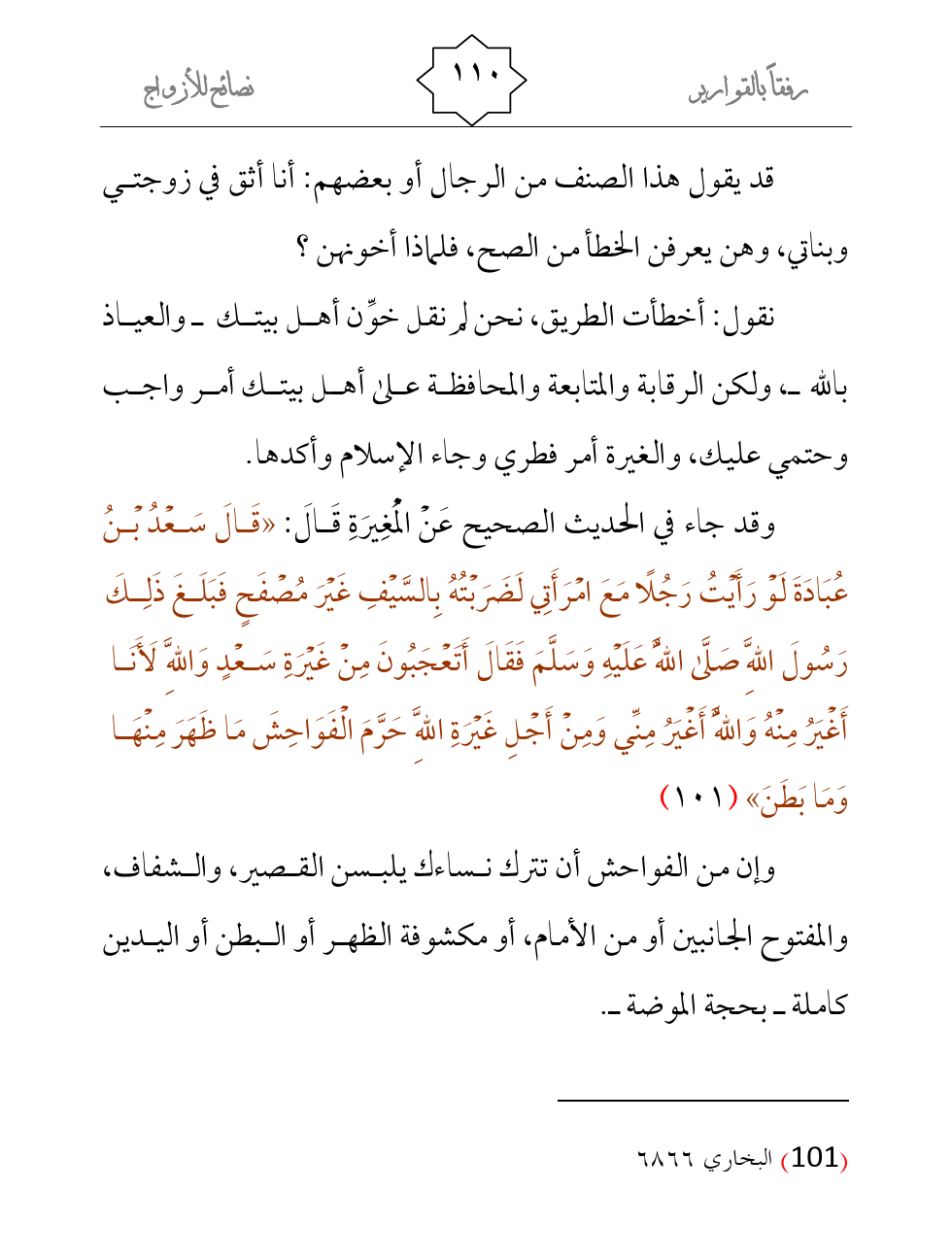 وقد جاء في الحديث الصحيح عَنْ الْمُغِيرَةِ قَالَ: «قَالَ سَعْدُ بْنُ عُبَادَةَ لَوْ رَأَيْتُ رَجُلًا مَعَ امْرَأَتِي لَضَرَبْتُهُ بِالسَّيْفِ غَيْرَ مُصْفَحٍ فَبَلَغَ ذَلِكَ رَسُولَ اللَّهِ صَلَّى اللَّهُ عَلَيْهِ وَسَلَّمَ فَقَالَ أَتَعْجَبُونَ مِنْ غَيْرَةِ سَعْدٍ وَاللَّهِ لَأَنَا أَغْيَرُ مِنْهُ وَاللَّهُ أَغْيَرُ مِنِّي وَمِنْ أَجْلِ غَيْرَةِ اللَّهِ حَرَّمَ الْفَوَاحِشَ مَا ظَهَرَ مِنْهَا وَمَا بَطَنَ» (¬1)