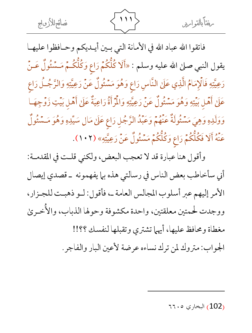 رَعِيَّتِهِ فَالْإِمَامُ الَّذِي عَلَى النَّاسِ رَاعٍ وَهُوَ مَسْئُولٌ عَنْ رَعِيَّتِهِ وَالرَّجُلُ رَاعٍ عَلَى أَهْلِ بَيْتِهِ وَهُوَ مَسْئُولٌ عَنْ رَعِيَّتِهِ وَالْمَرْأَةُ رَاعِيَةٌ عَلَى أَهْلِ بَيْتِ زَوْجِهَا وَوَلَدِهِ وَهِيَ مَسْئُولَةٌ عَنْهُمْ وَعَبْدُ الرَّجُلِ رَاعٍ عَلَى مَالِ سَيِّدِهِ وَهُوَ مَسْئُولٌ عَنْهُ أَلَا فَكُلُّكُمْ رَاعٍ وَكُلُّكُمْ مَسْئُولٌ عَنْ رَعِيَّتِهِ» (¬1) .