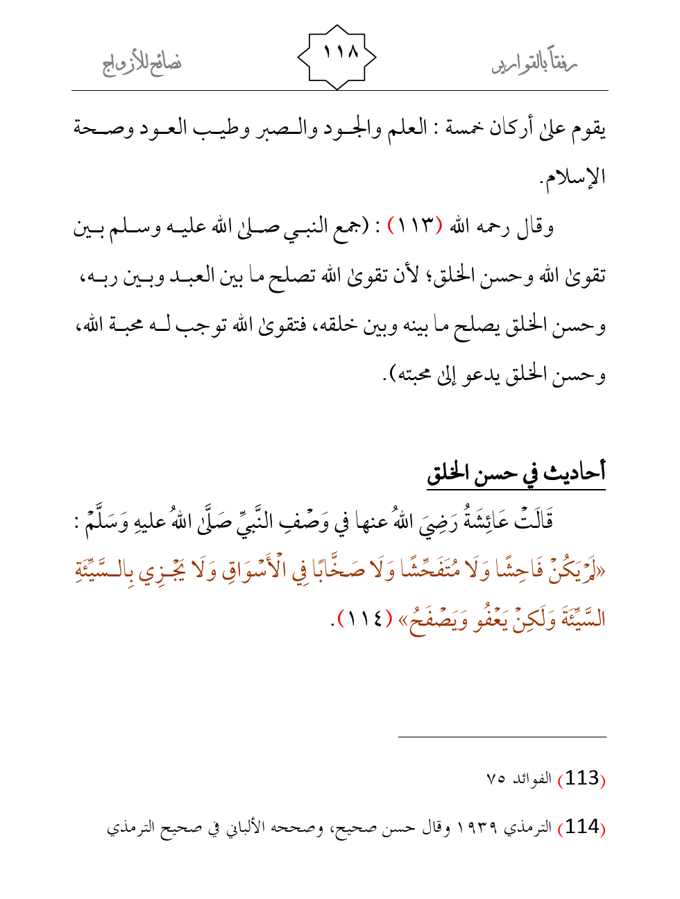 يقوم على أركان خمسة: العلم والجود والصبر وطيب العود وصحة الإسلام.