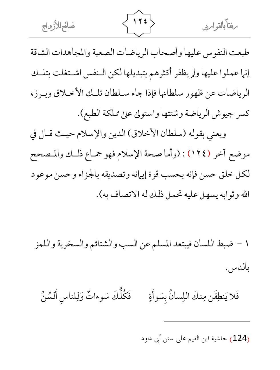 1 - ضبط اللسان فيبتعد المسلم عن السب والشتائم والسخرية واللمز بالناس.