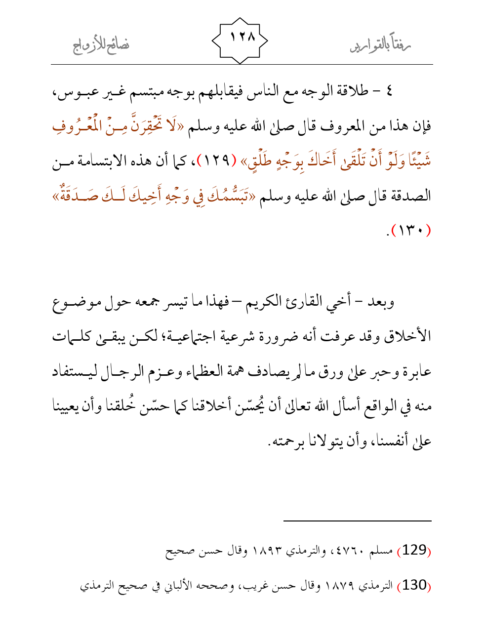 4 - طلاقة الوجه مع الناس فيقابلهم بوجه مبتسم غير عبوس، فإن هذا من المعروف قال صلى الله عليه وسلم «لَا تَحْقِرَنَّ مِنْ الْمَعْرُوفِ شَيْئًا وَلَوْ أَنْ تَلْقَى أَخَاكَ بِوَجْهٍ طَلْقٍ» (¬1) ، كما أن هذه الابتسامة من الصدقة قال صلى الله عليه وسلم «تَبَسُّمُكَ فِي وَجْهِ أَخِيكَ لَكَ صَدَقَةٌ» (¬2) .