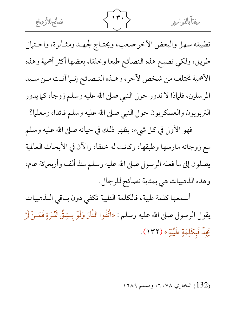 تطبيقه سهل والبعض الآخر صعب، ويحتاج لجهد ومثابرة، واحتمال طويل، ولكي تصبح هذه النصائح طبعا وخلقا، بعضها أكثر أهمية وهذه الأهمية تختلف من شخص لآخر، وهذه النصائح إنما أتت من سيد المرسلين، فلماذا لا ندور حول النبي صلى الله عليه وسلم زوجا، كما يدور التربويون والعسكريون حول النبي صلى الله عليه وسلم قائدا، ومعلما؟